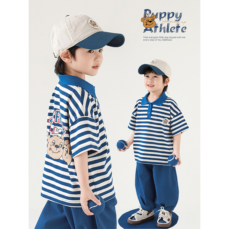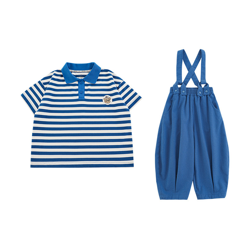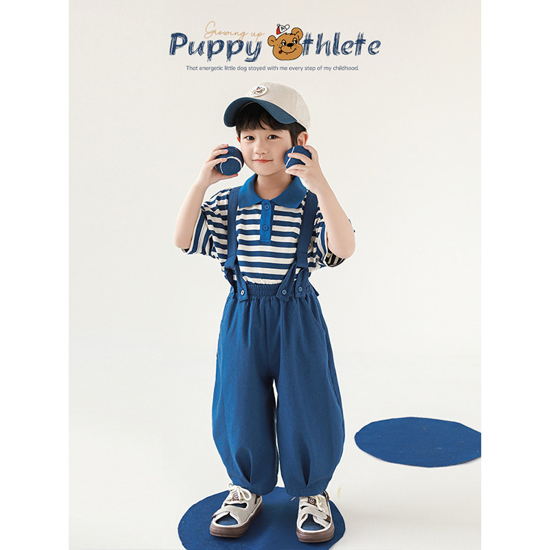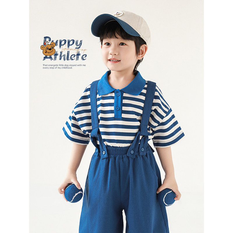 幼悠 男童2026夏季新款条纹翻领清凉短袖t恤宽松显瘦背带裤套装潮