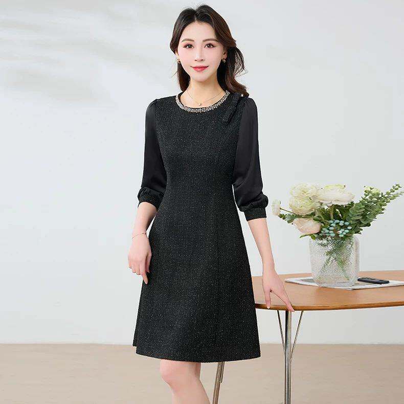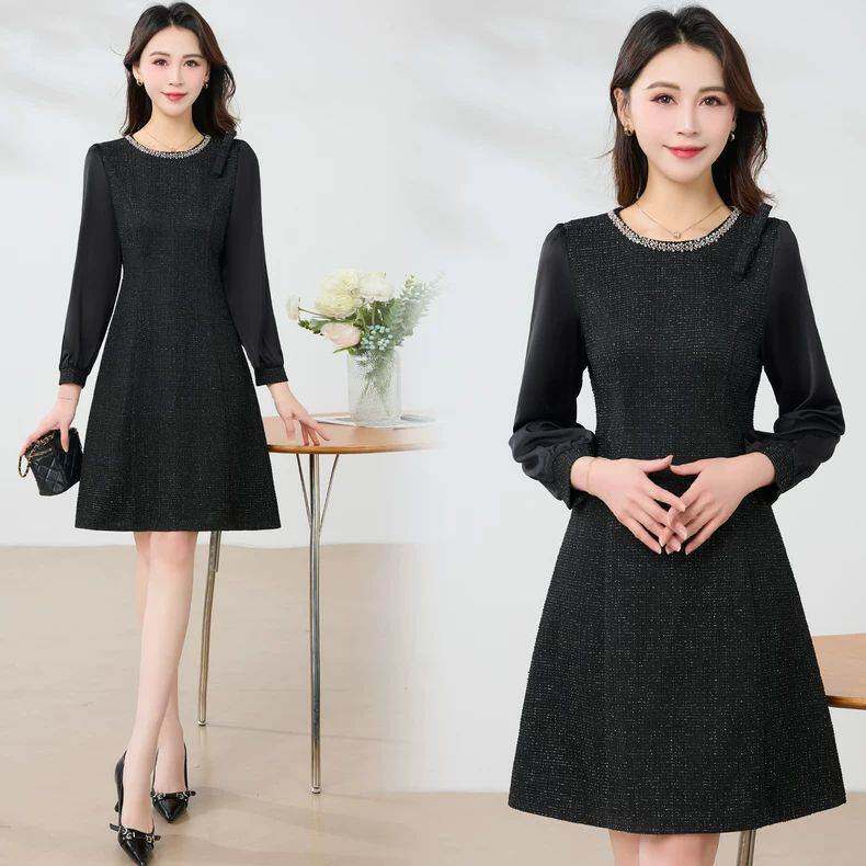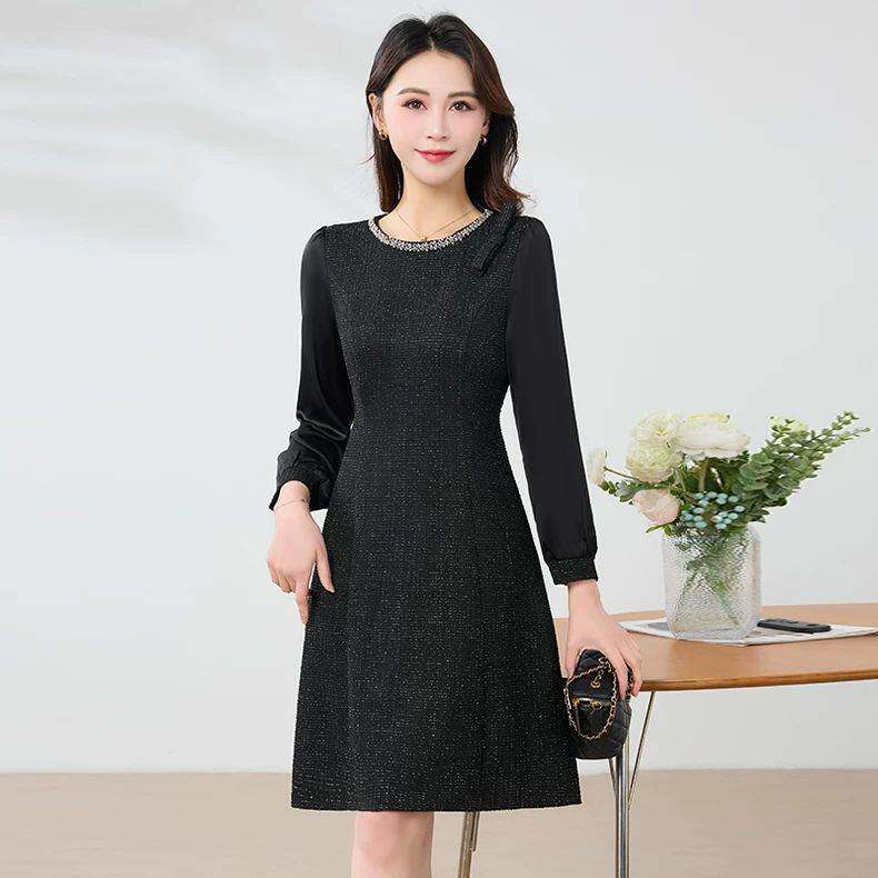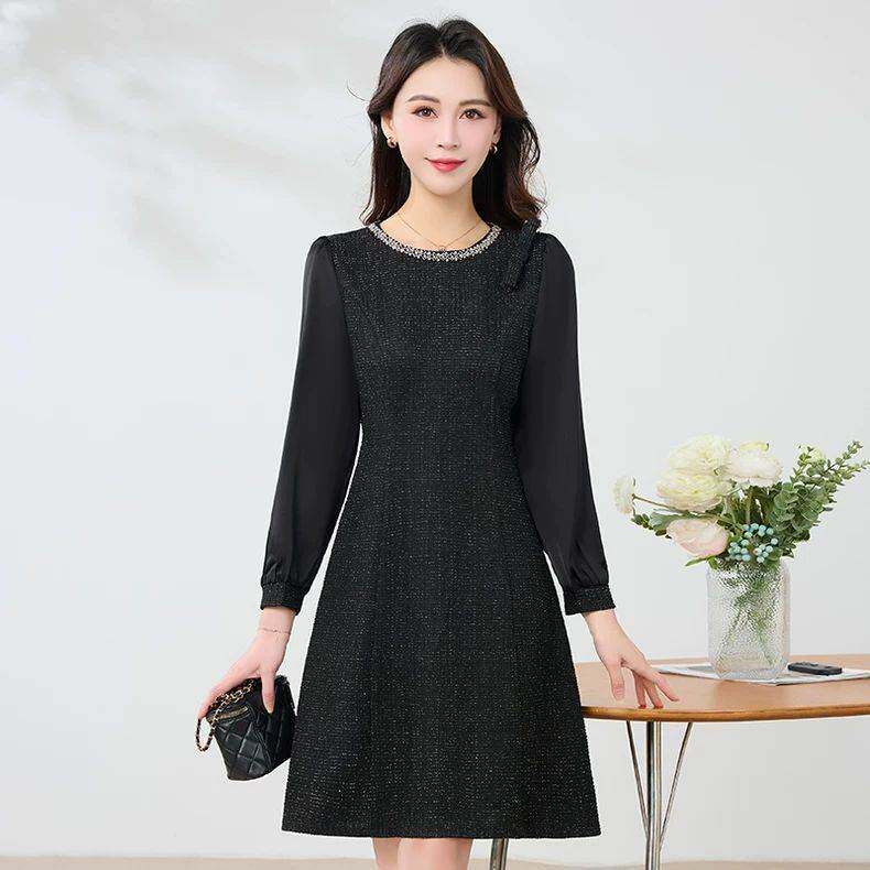 轻奢小香风钉珠圆领长袖连衣裙女春装2026新款小个子显瘦字裙子