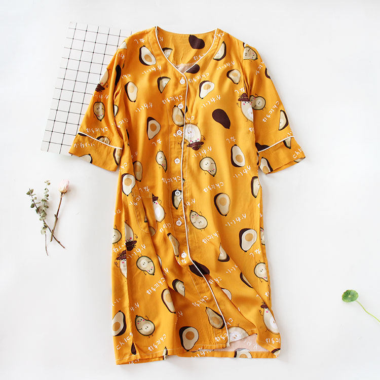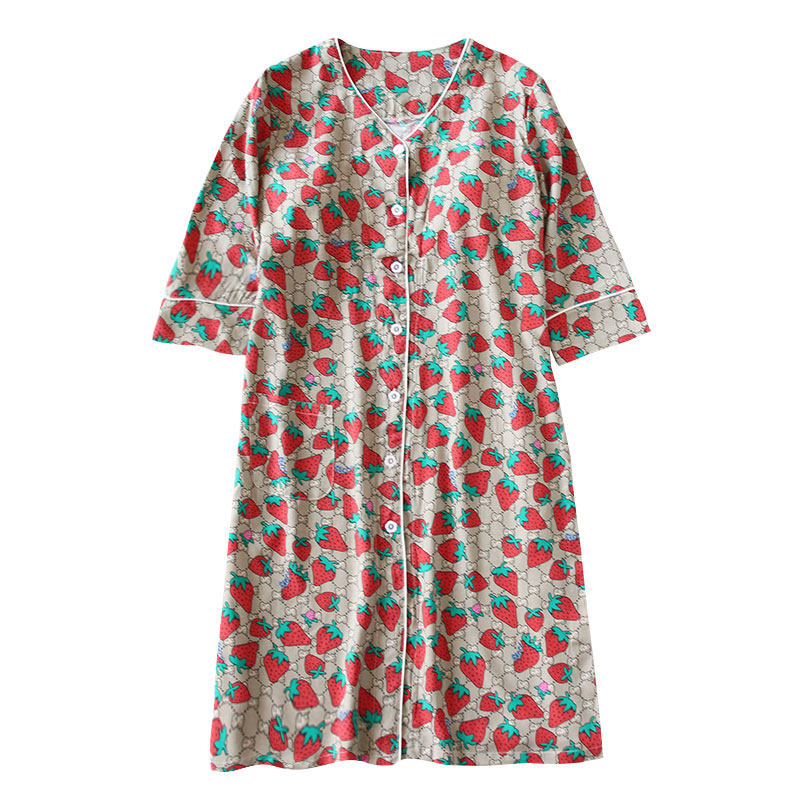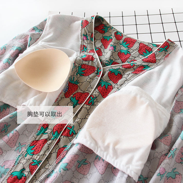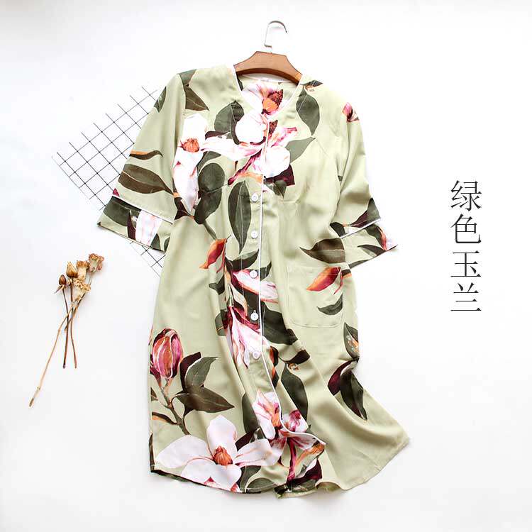 女士绵绸睡裙带胸垫 无领人造棉夏天裙子可外穿前开扣七分袖薄款