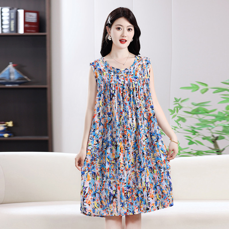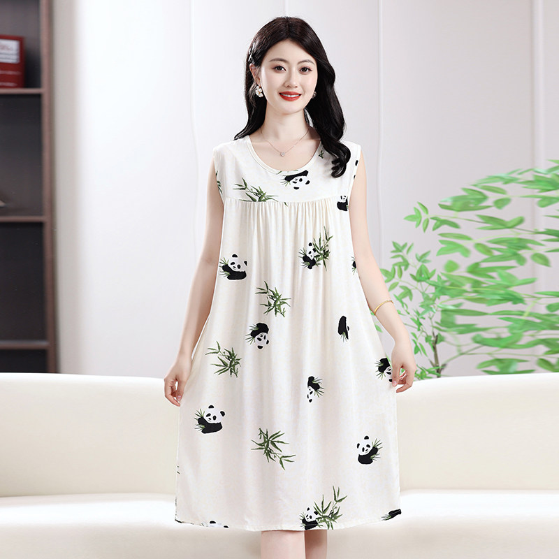 绵绸睡裙女士夏季宽松大码无袖背心裙子人造棉家居服妈妈棉绸睡衣
