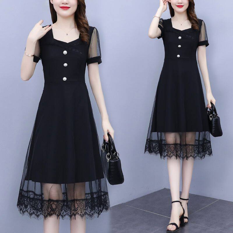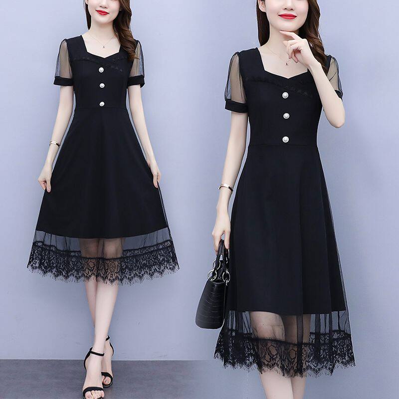 夏季连衣裙2026新款时尚网纱拼接修身显瘦大码胖mm中长款夏天裙子