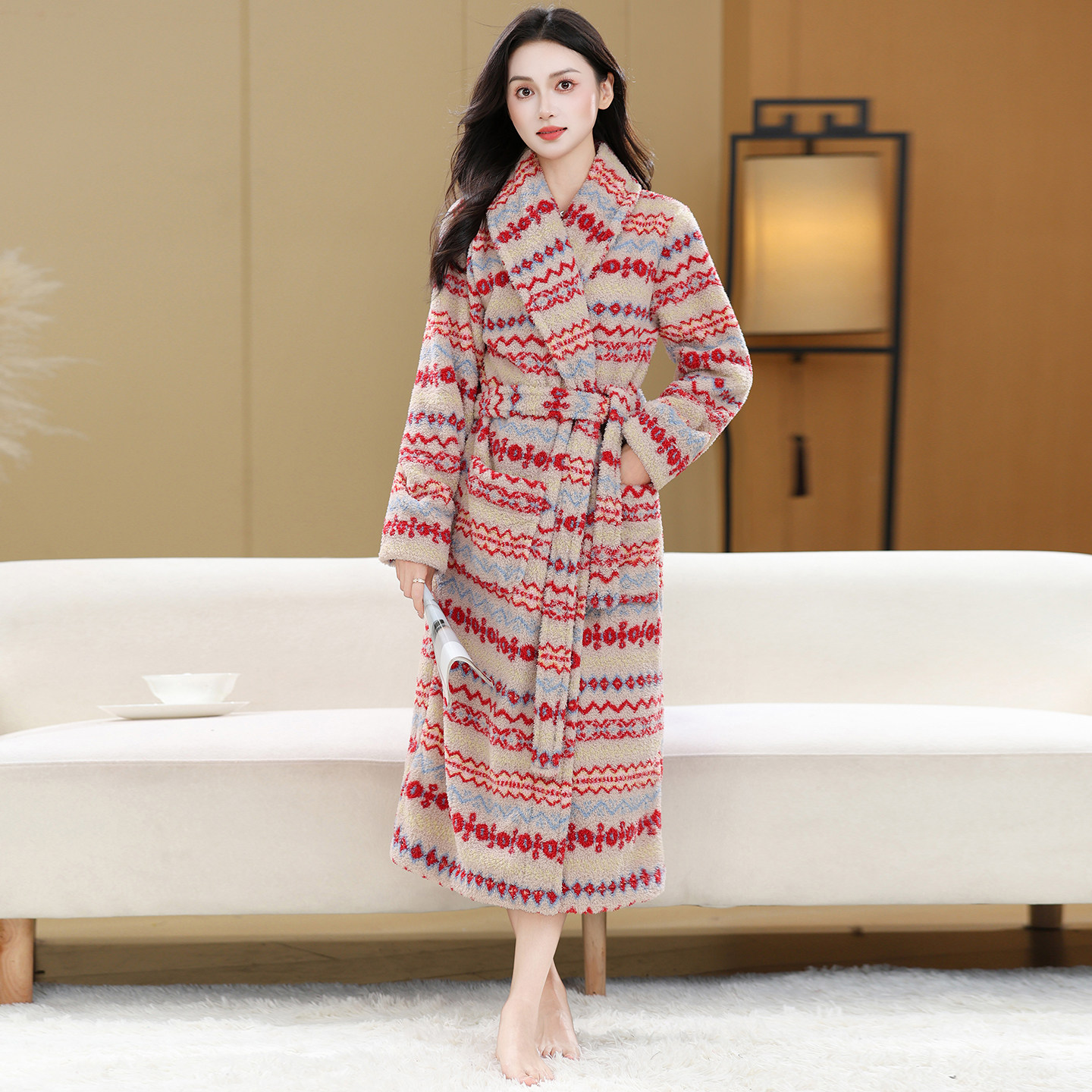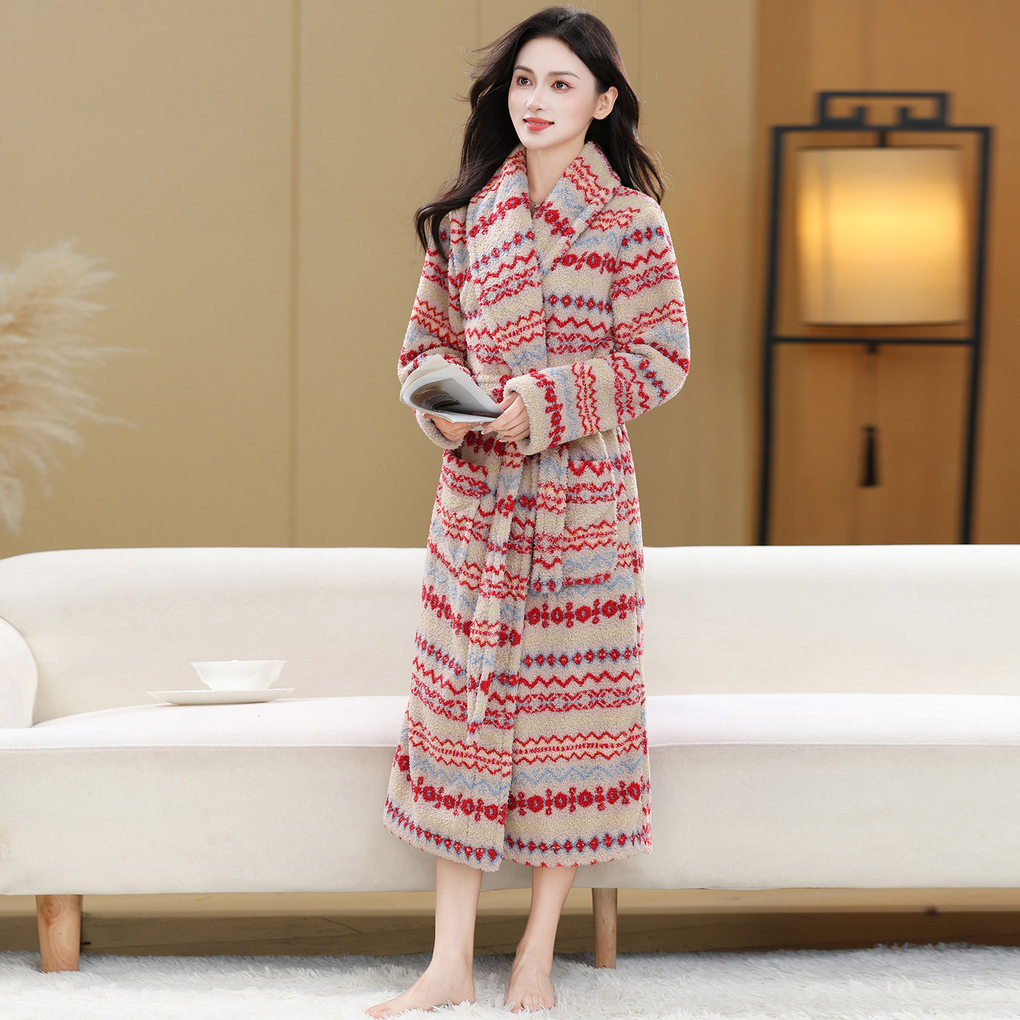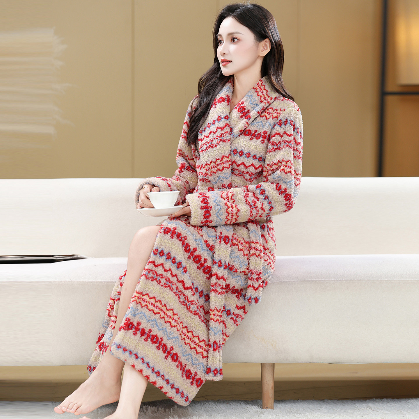 法兰绒睡袍女冬季新款加厚加绒长款系带浴袍轻奢睡衣家居服套装