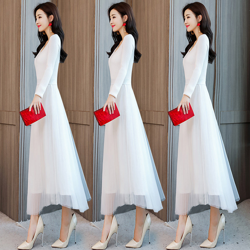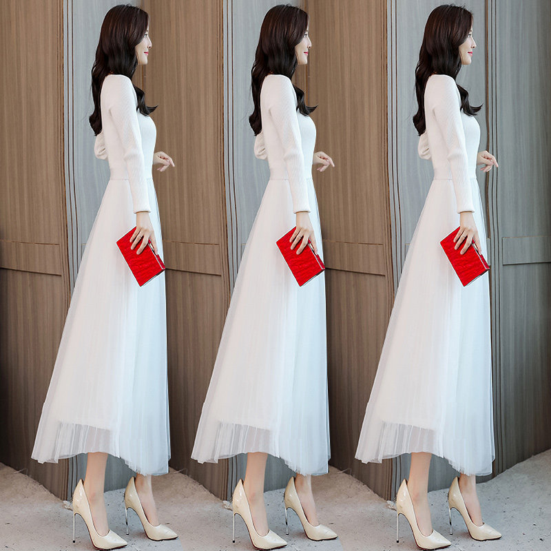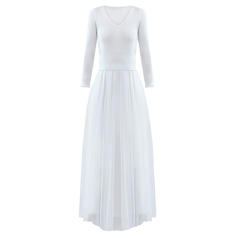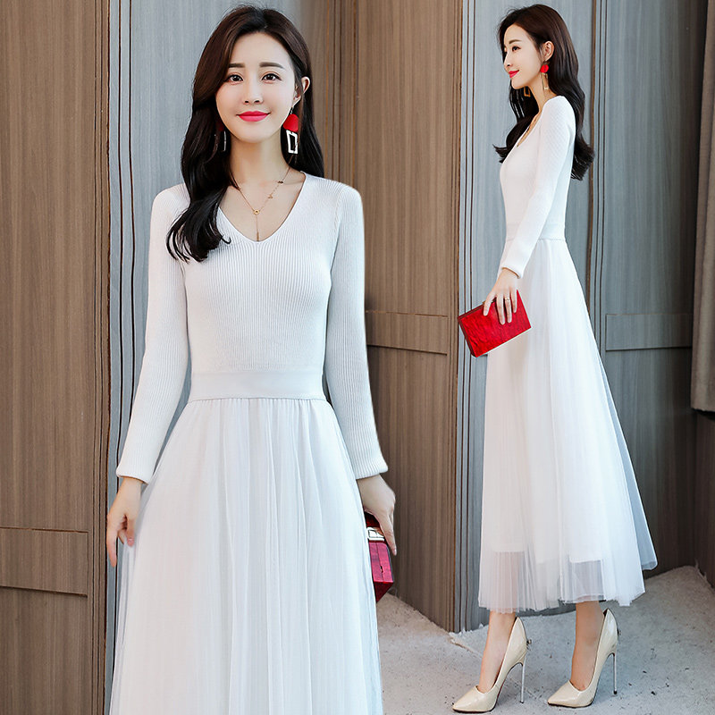 白色针织连衣裙v领长袖秋冬2026新款网纱裙子秋装打底毛衣长裙