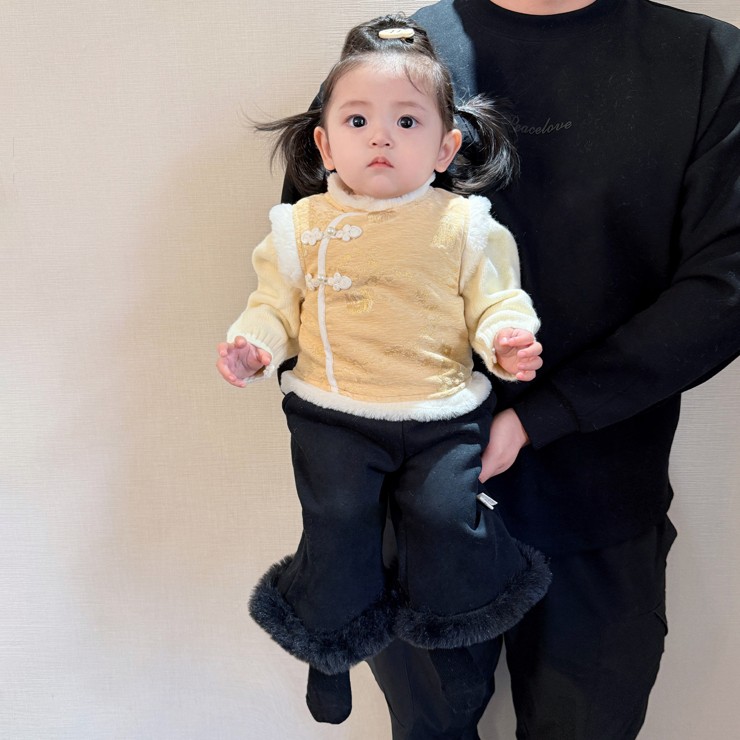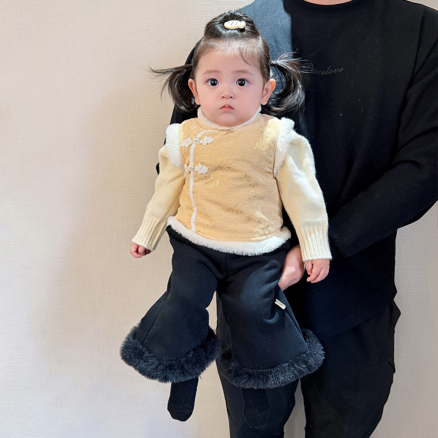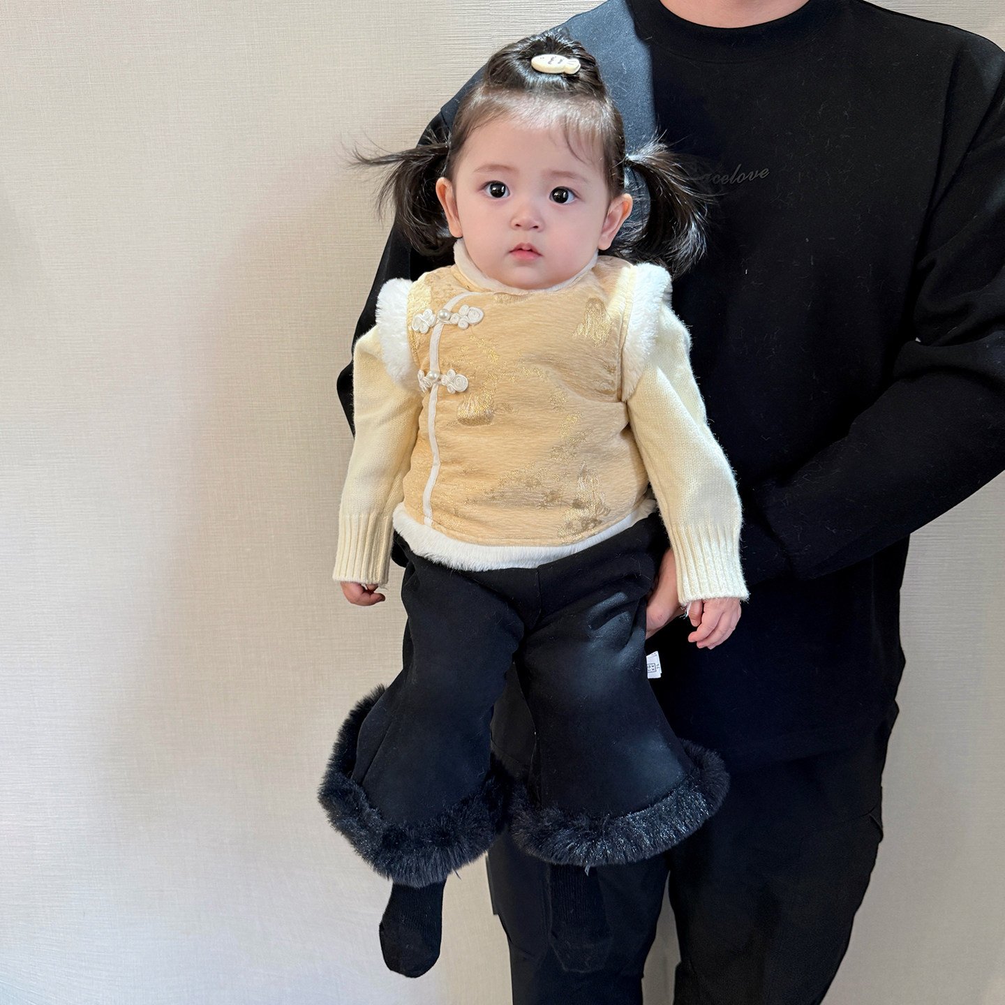 女宝宝冬款新中式马甲套装女童新年加绒背心加厚毛衣婴儿保暖裤子
