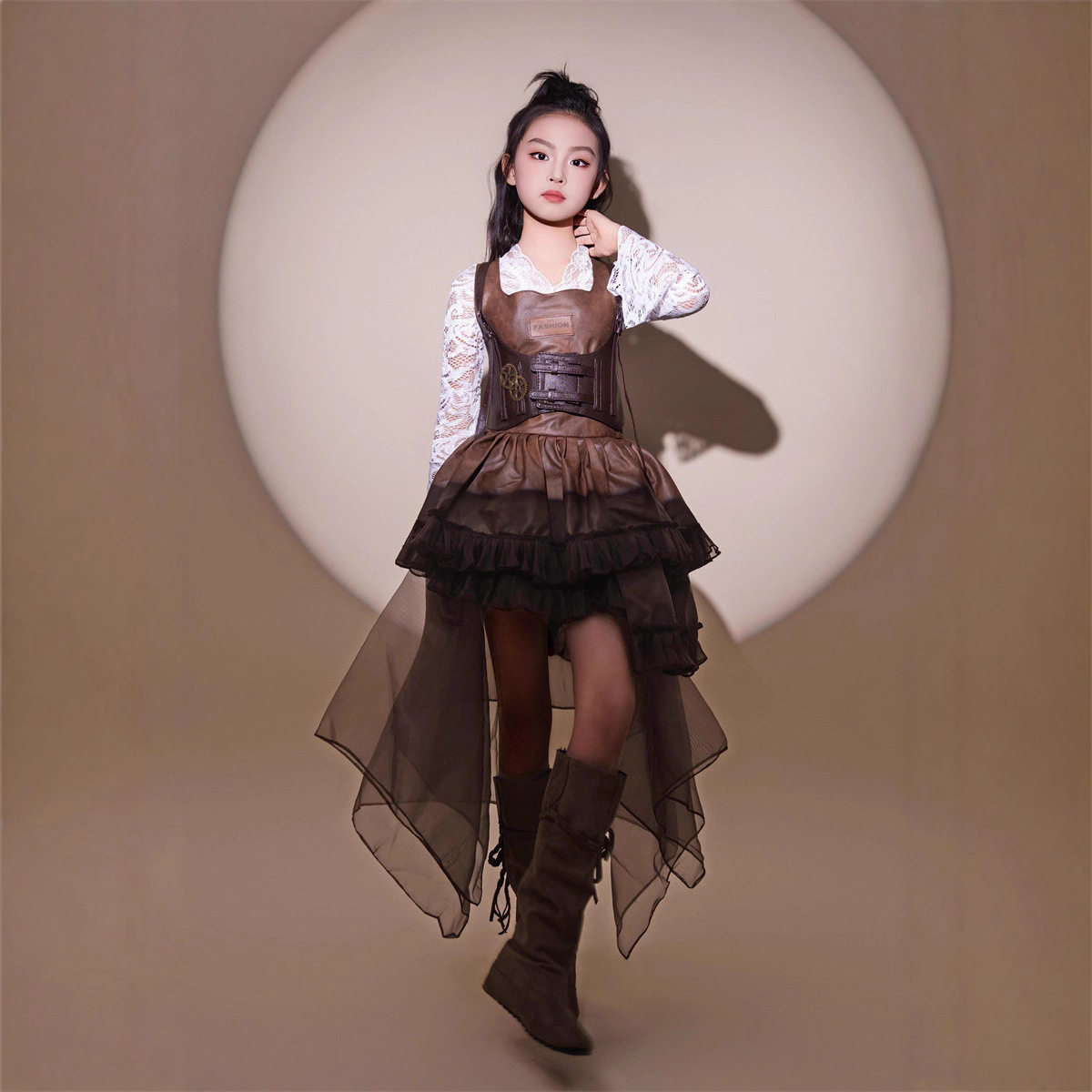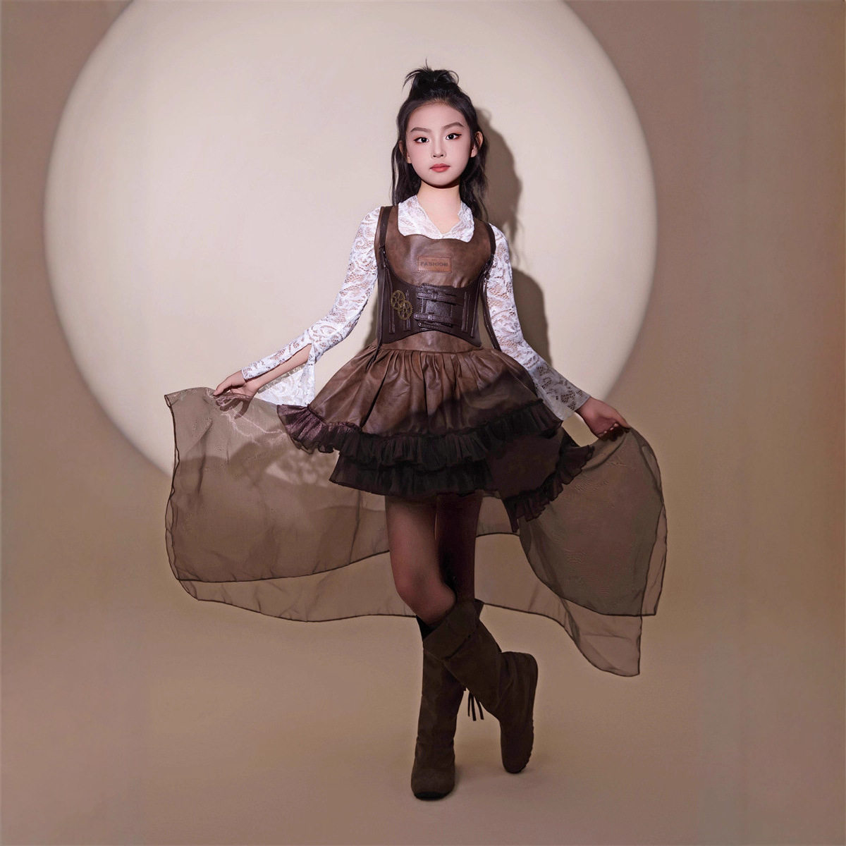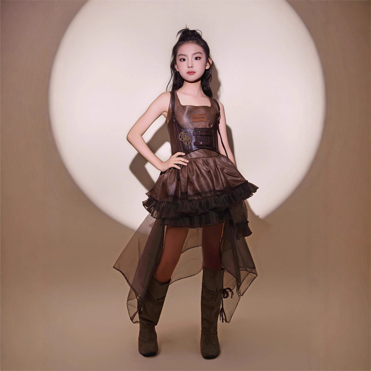 女童棕咖连衣裙皮朋克复古风走秀T台机械风中大童走秀秋冬礼服裙