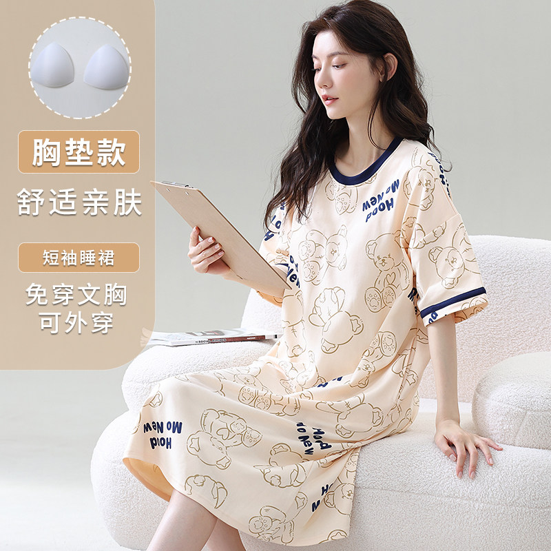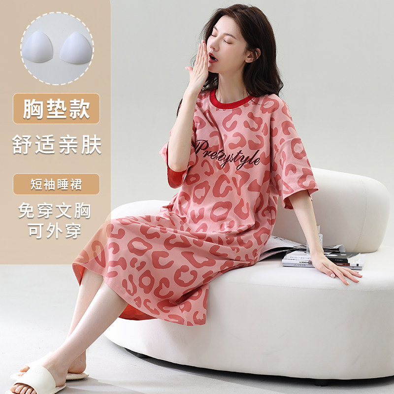 带胸垫一体睡裙女夏季纯棉长款过膝睡衣夏天大码胖mm家居服连衣裙