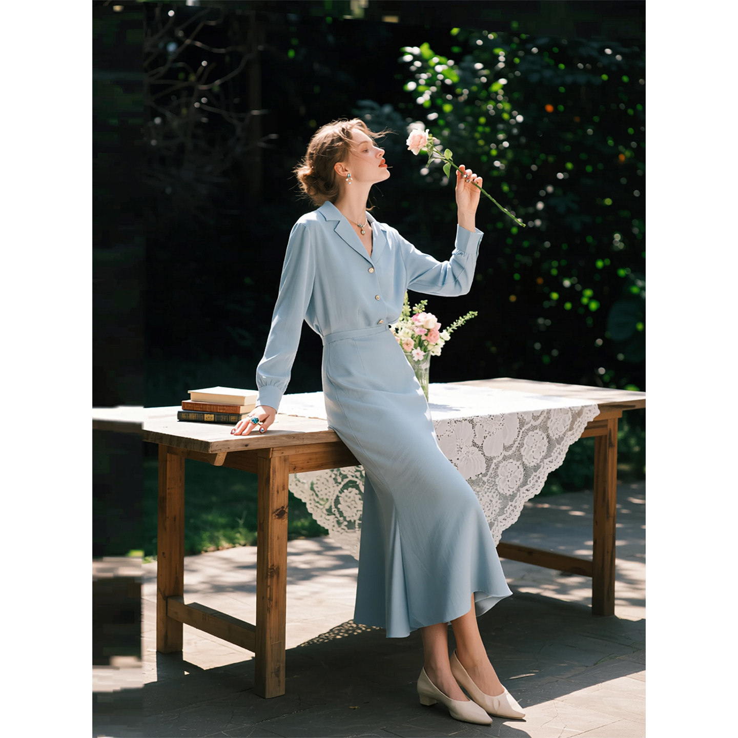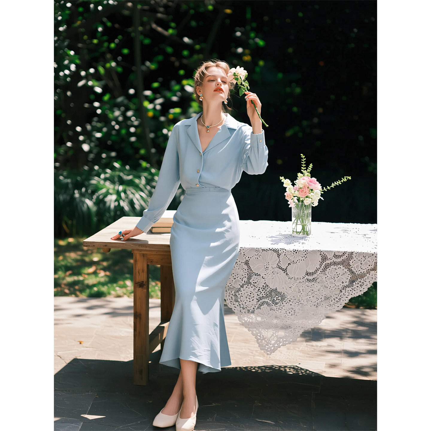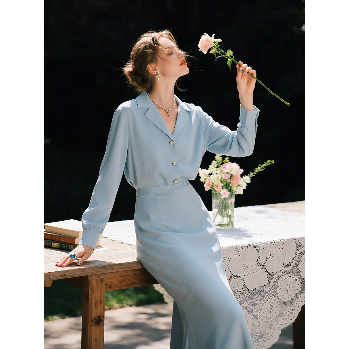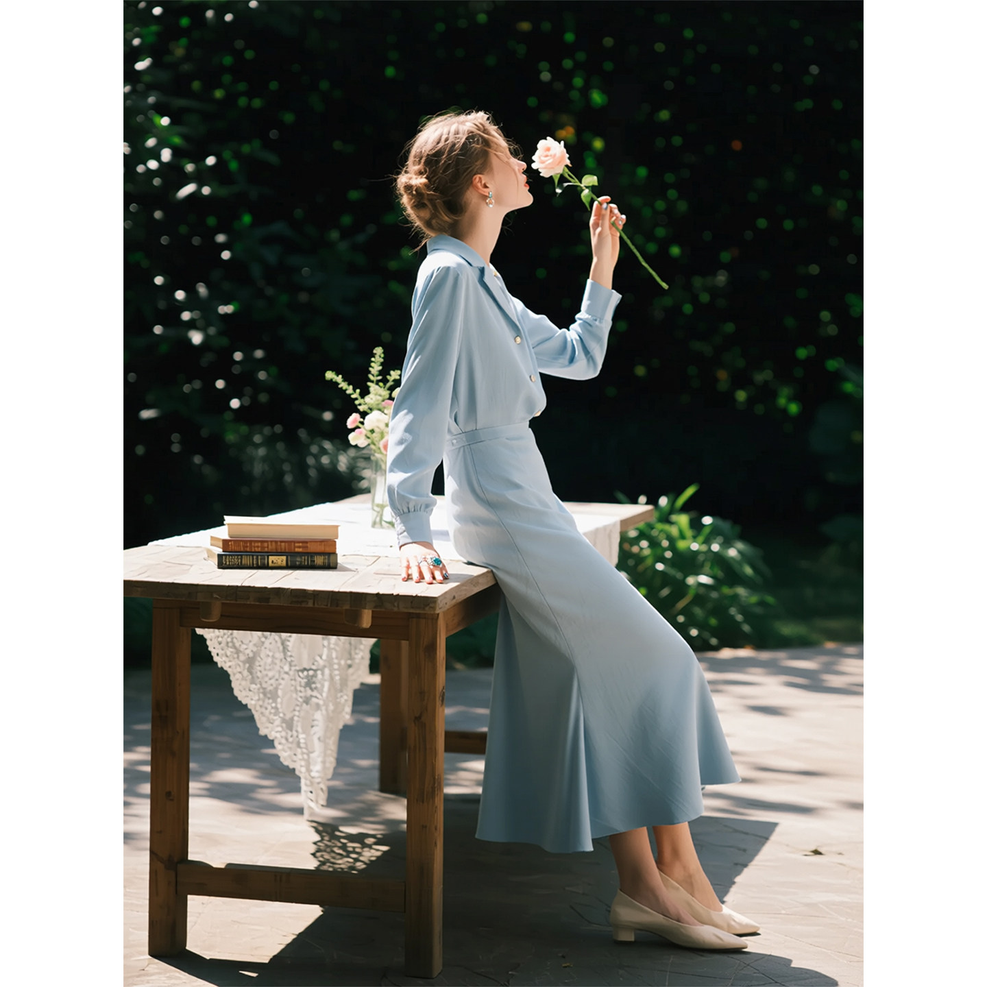 蓝色套装女2026年春季新款女装衬衫半身裙两件套法式早春漂亮穿搭