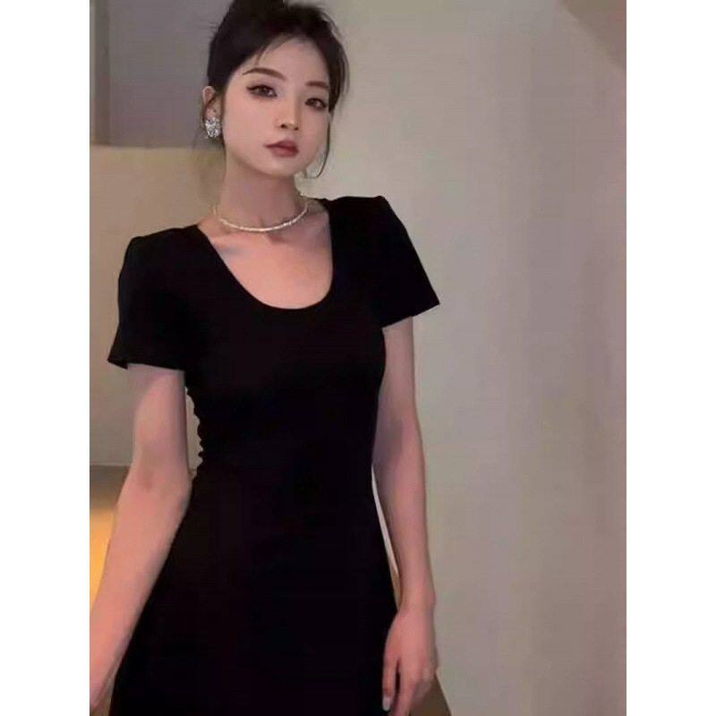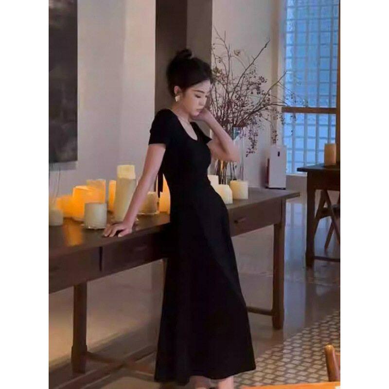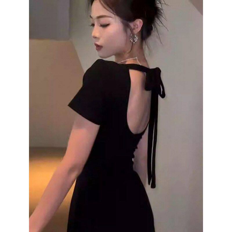 法式复古赫本风黑色露背连衣裙女夏季高级感气质收腰显瘦a字长裙