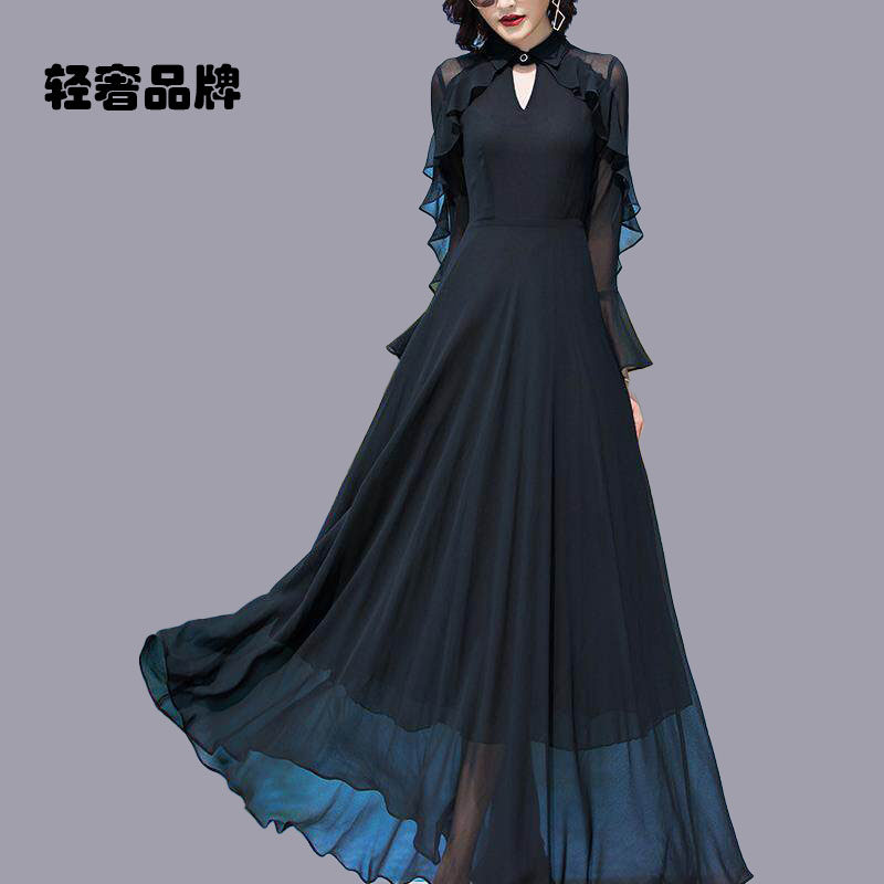 朗姿约定裙子2026年新款雪纺V领夏天收腰长裙长款大摆长袖连衣裙