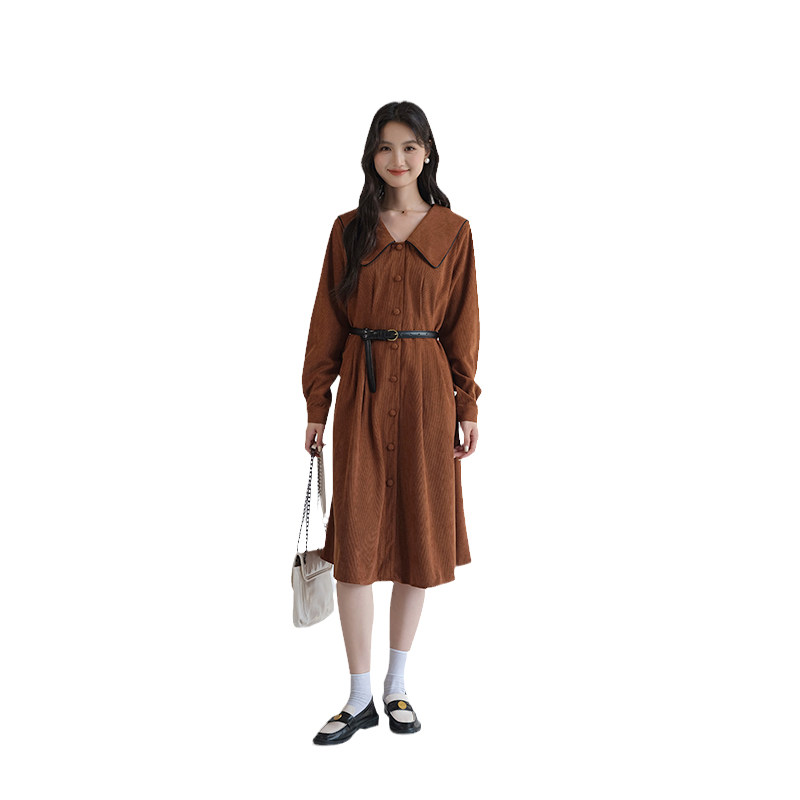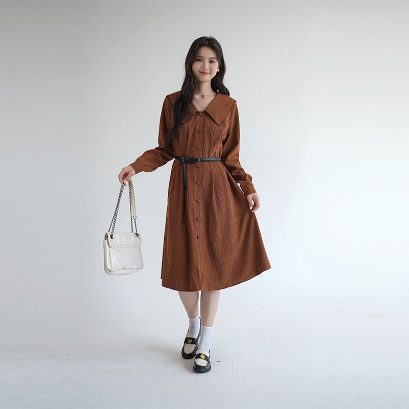 311线报网描述:赫本风气质娃娃领收腰遮肚显瘦灯芯绒连衣裙