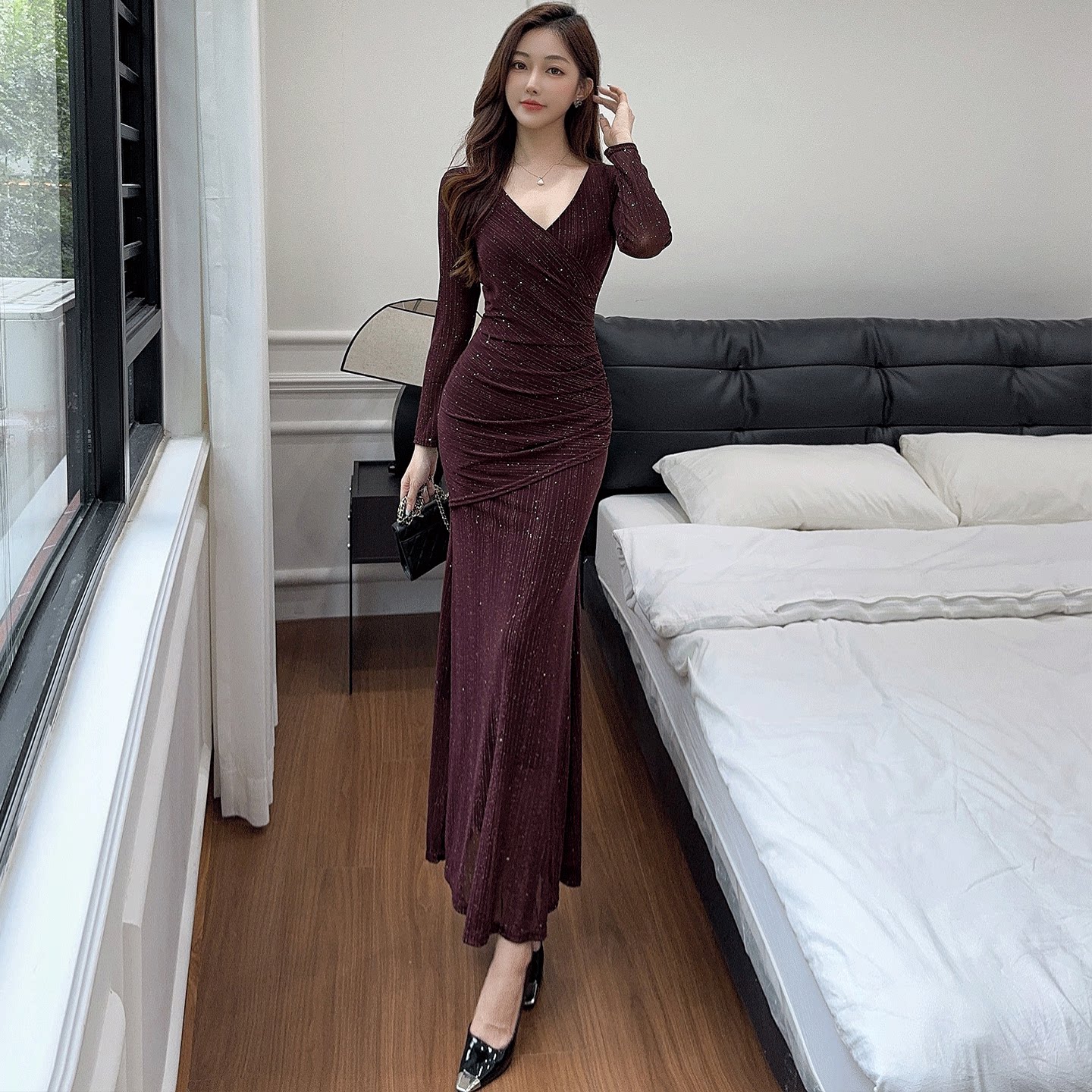 气质高级时尚名媛连衣裙长袖礼服修身显瘦长裙新款女装低胸网纱裙