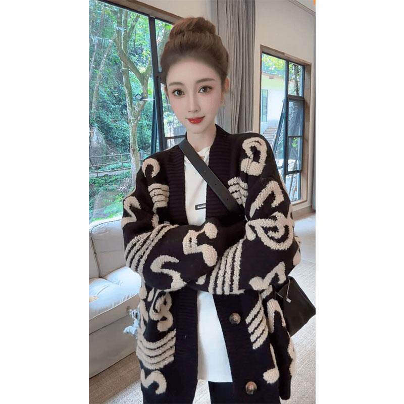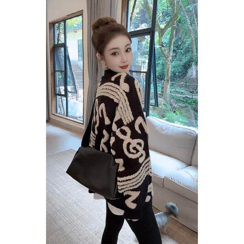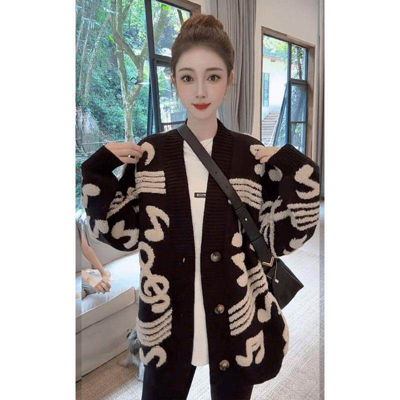 撞色音符毛衣开衫外套女秋冬季宽松慵懒风高级感中长款加厚针织衫