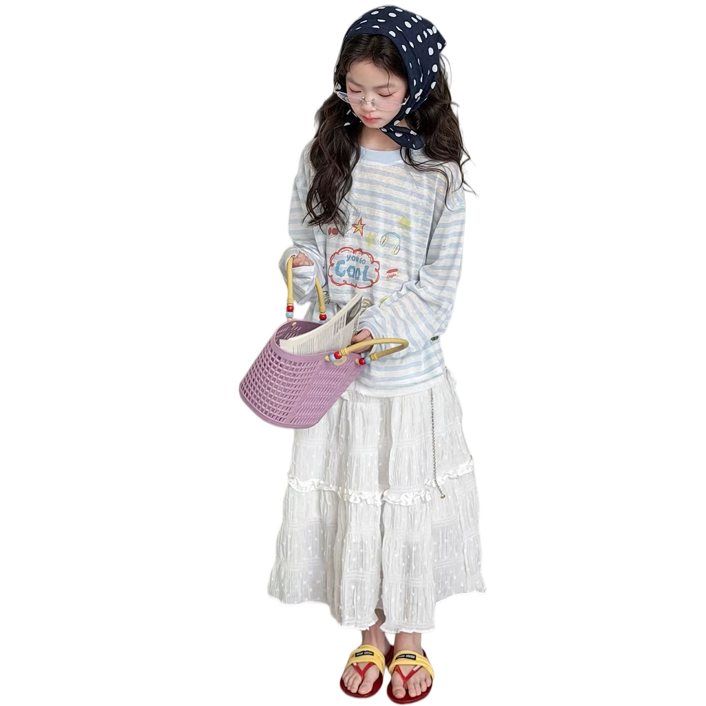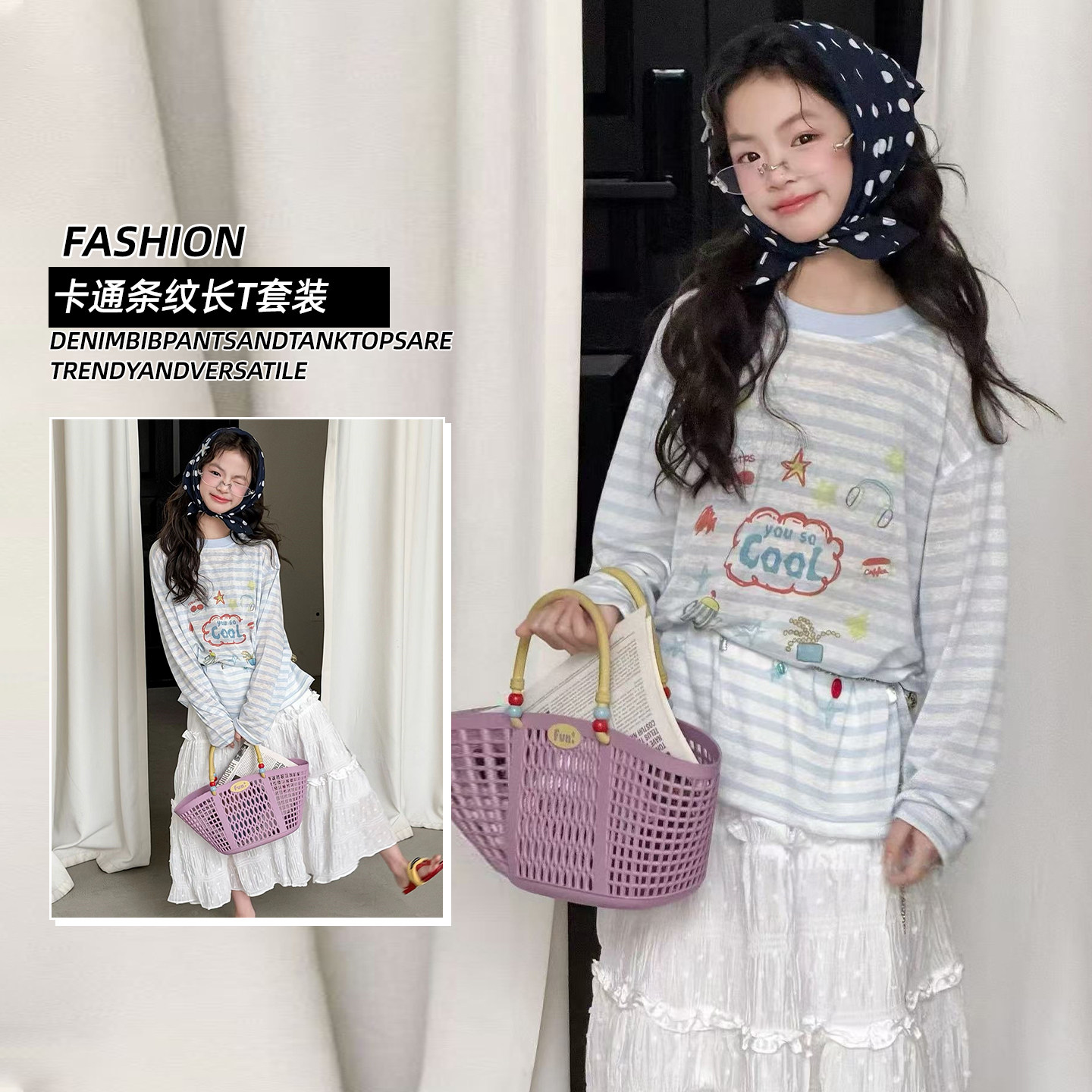 女童春装卡通长袖T恤套装2026新款洋气条纹上衣女孩半身裙两件套