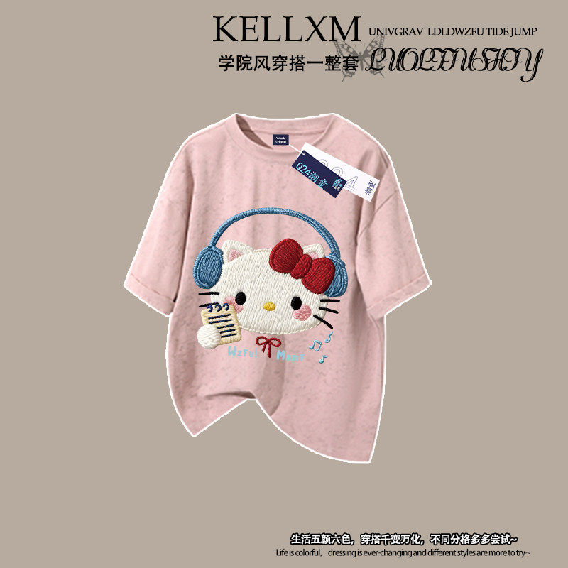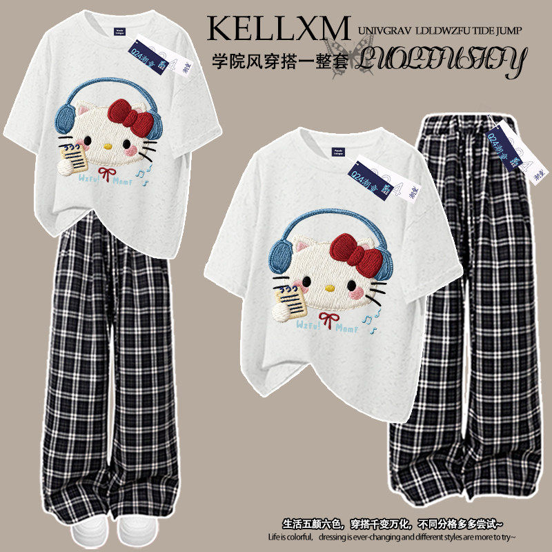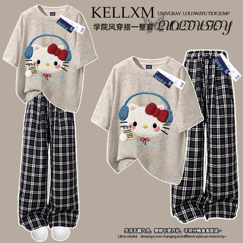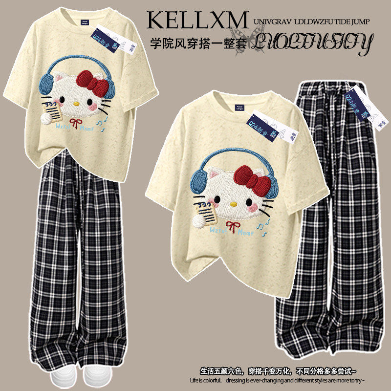 小猫女童扎染纯棉短袖T恤格子阔腿裤两件套中大童夏季款洋气套装