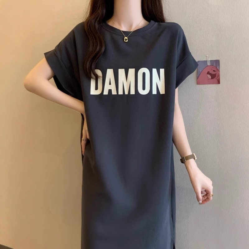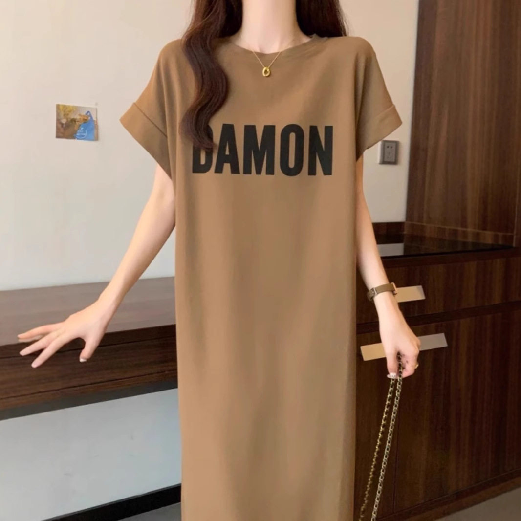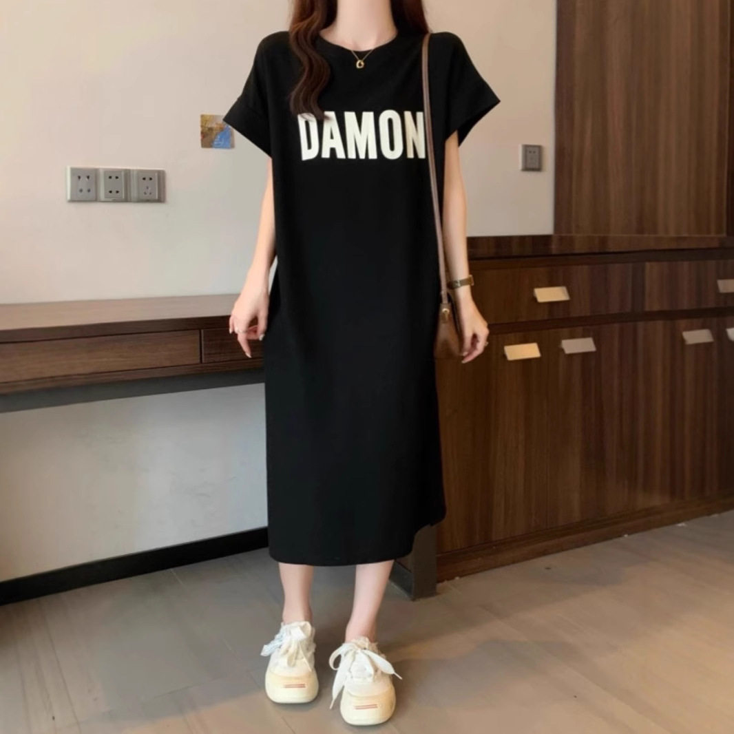 大码女装短袖t恤连衣裙夏季胖mm宽松显瘦遮肚子直筒休闲过膝裙子