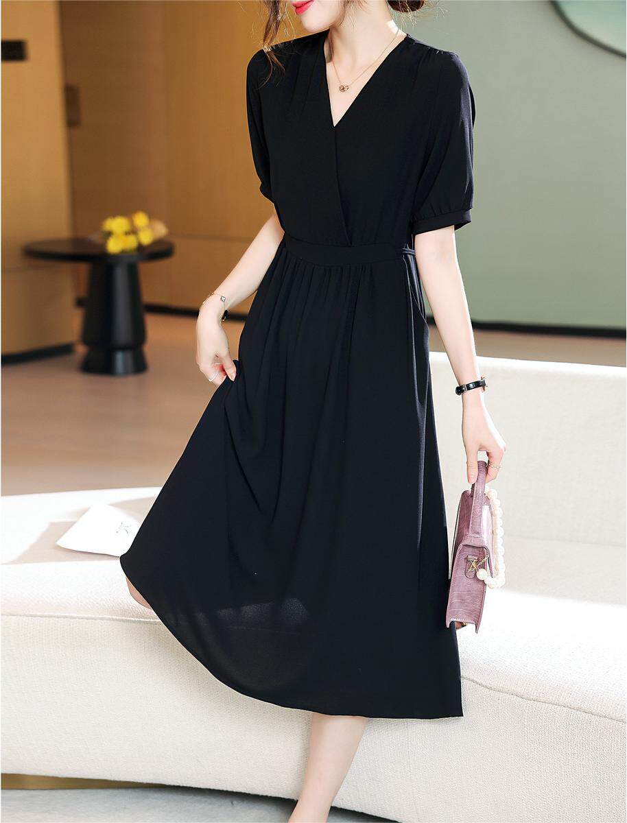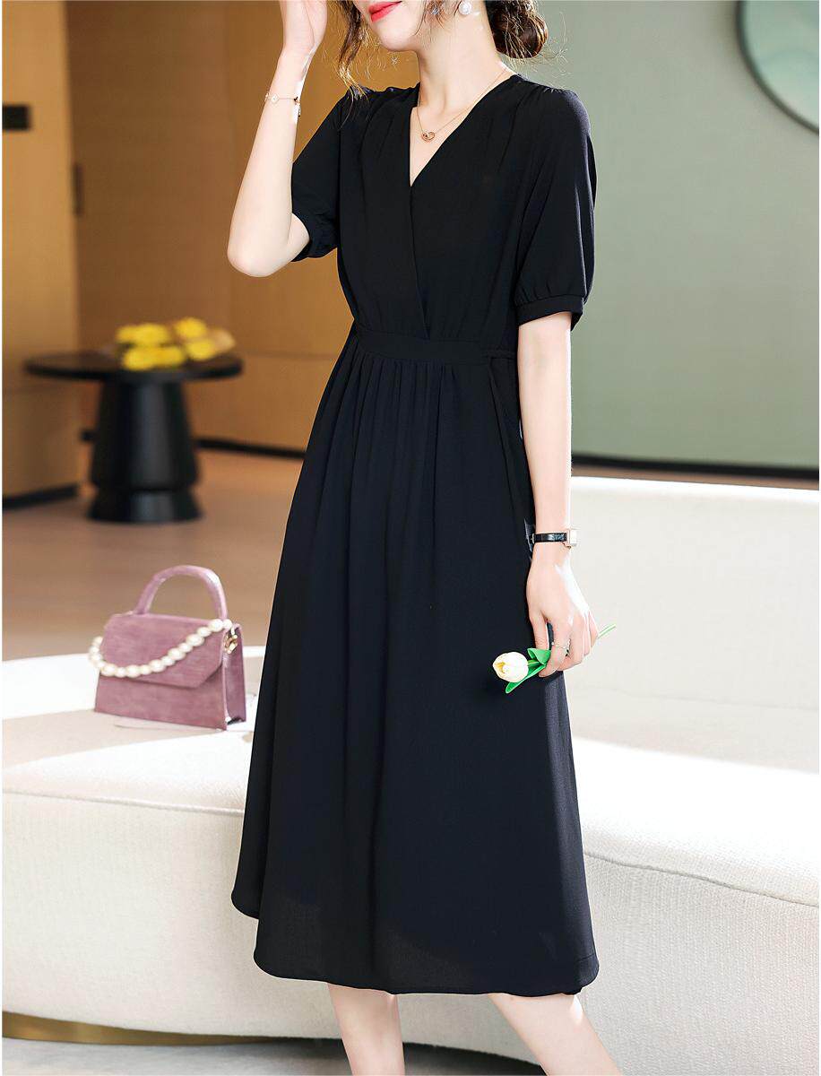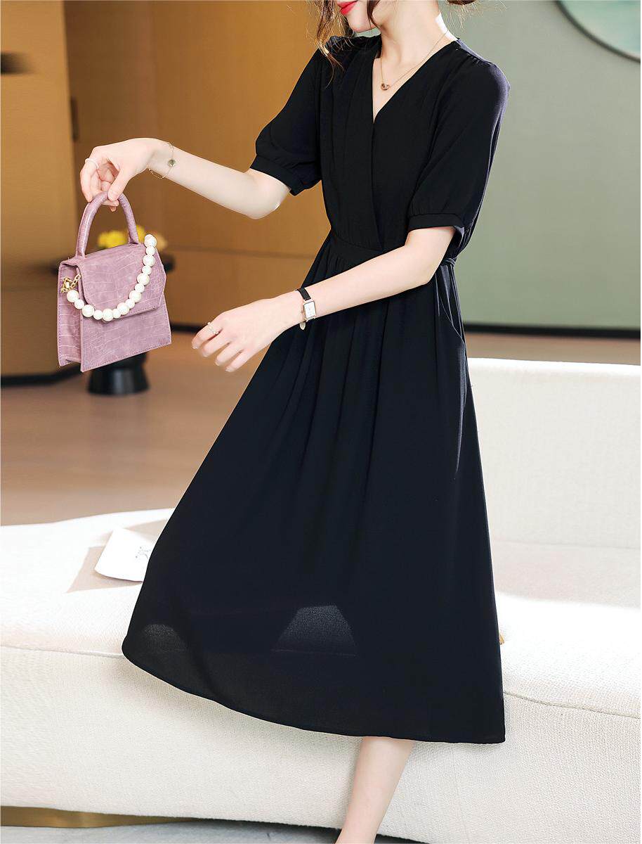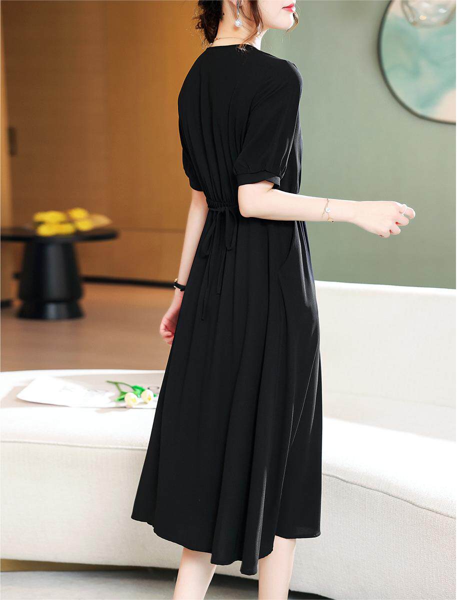 改良汉服黑色雪纺连衣裙长裙收腰2025夏新款交叉领显瘦大摆裙子薄