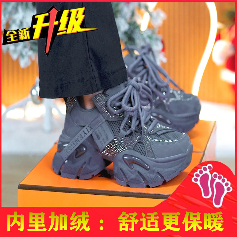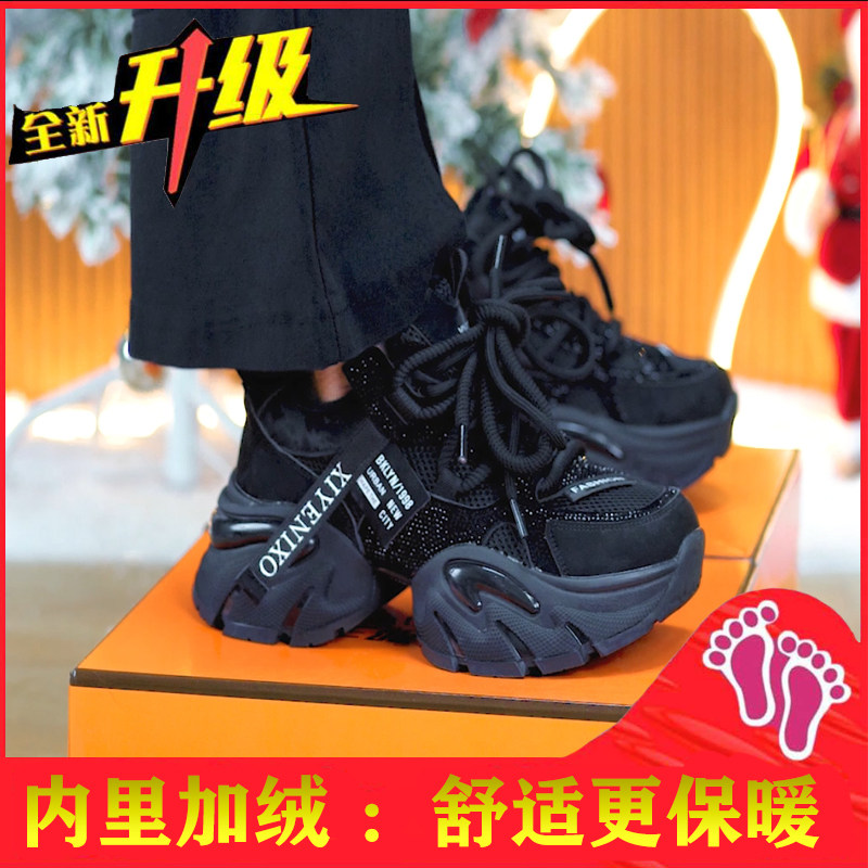 【单/棉】7cm小个子水钻厚底老爹鞋女2025秋冬百搭增高休闲运动鞋