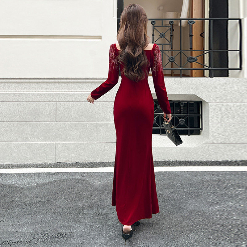 轻奢性感宴会风修身显瘦丝绒连衣裙女V领长袖开叉气质高级感礼服