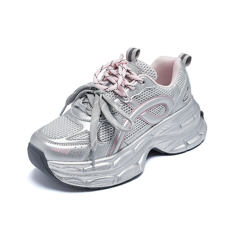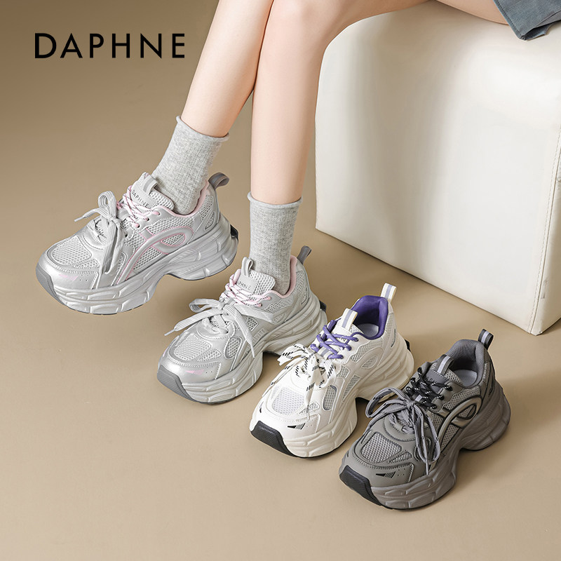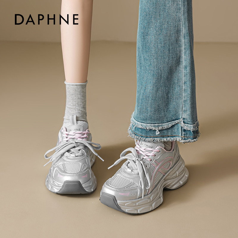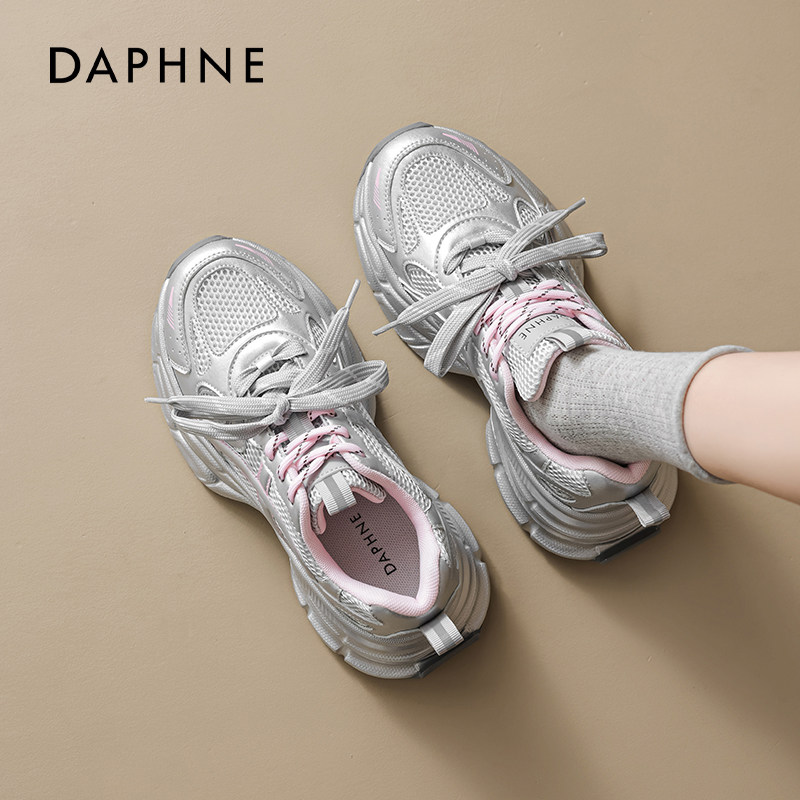 达芙妮银粉色厚底老爹鞋女款2026新款透气增高轻便软底超轻休闲鞋