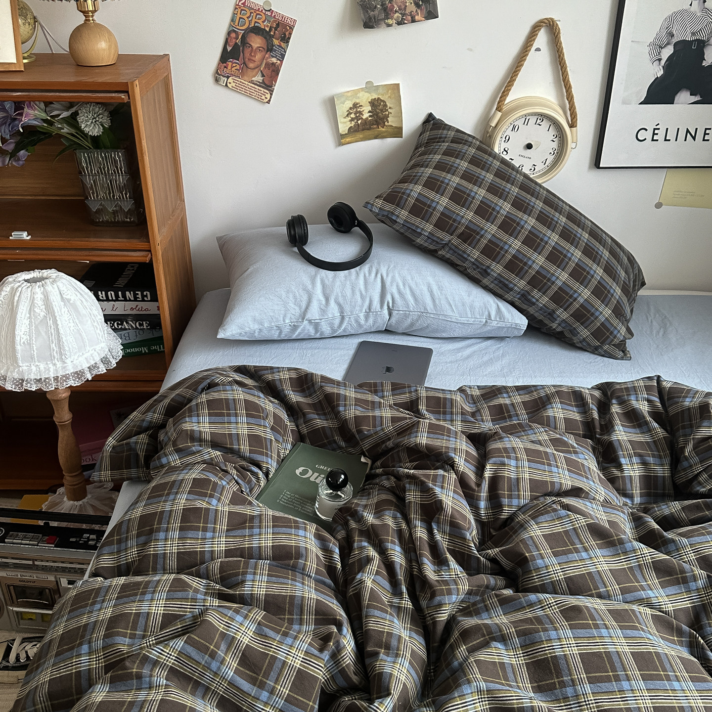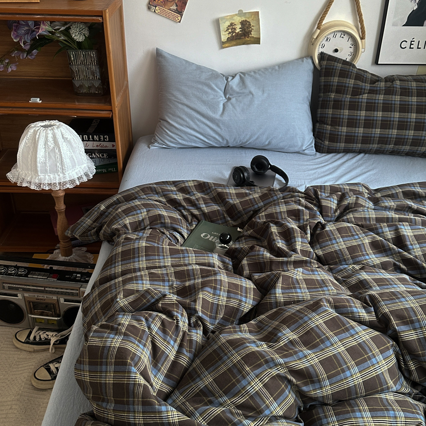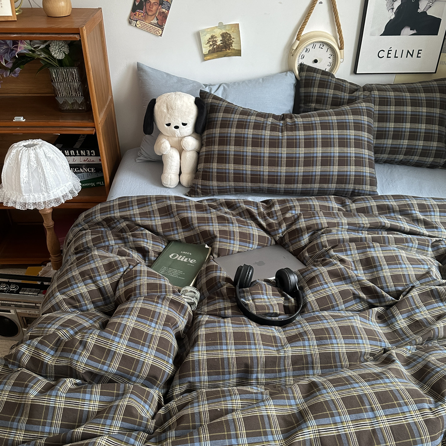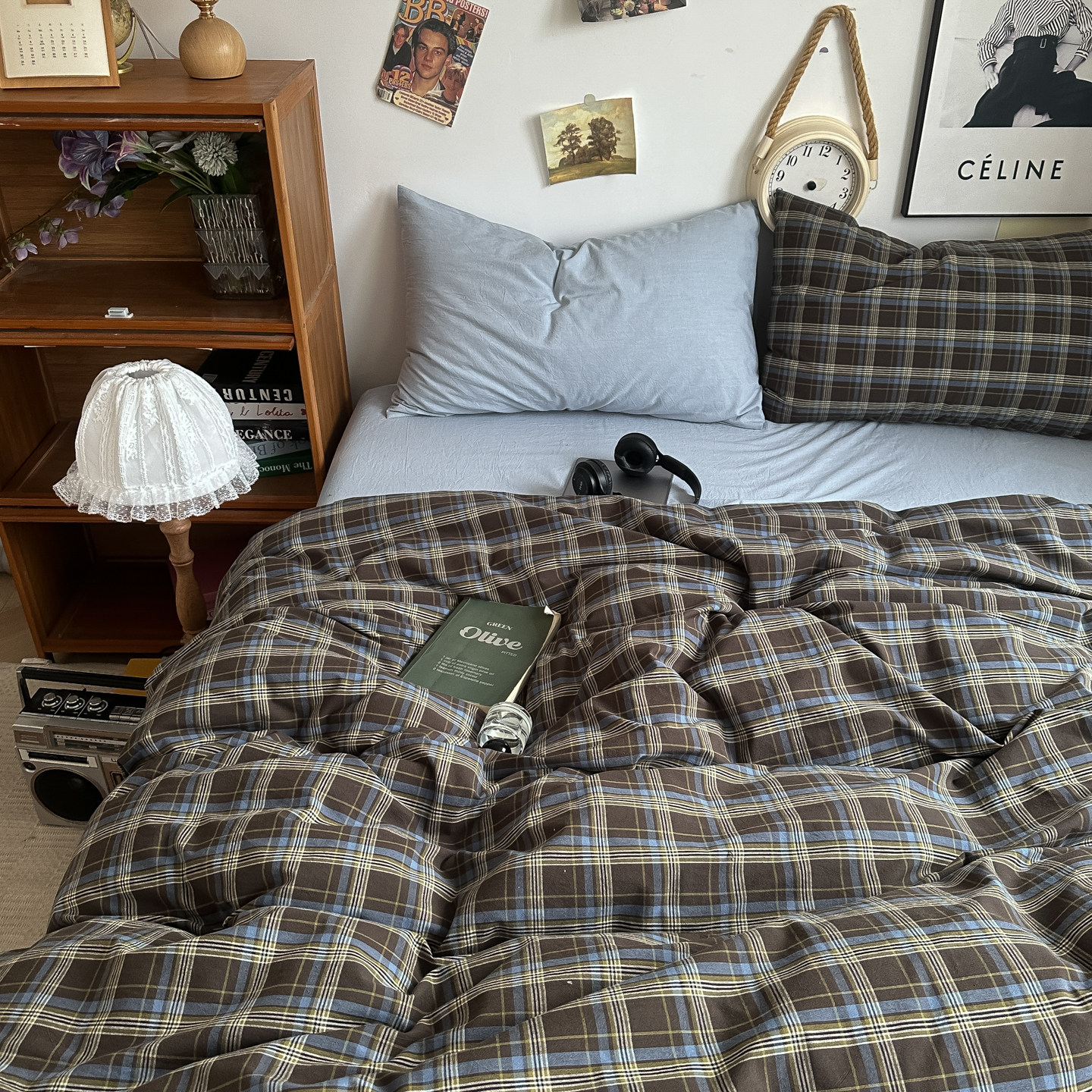 北欧简约风纯棉水洗棉格子四件套学院风全棉男生床单中性床上用品