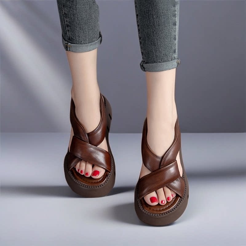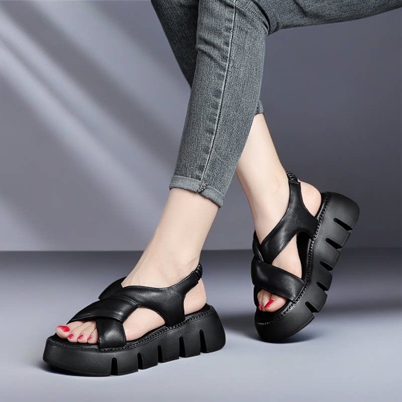 真皮厚底增高露趾凉鞋女2026年夏季头层牛皮时尚交叉白色罗马凉鞋