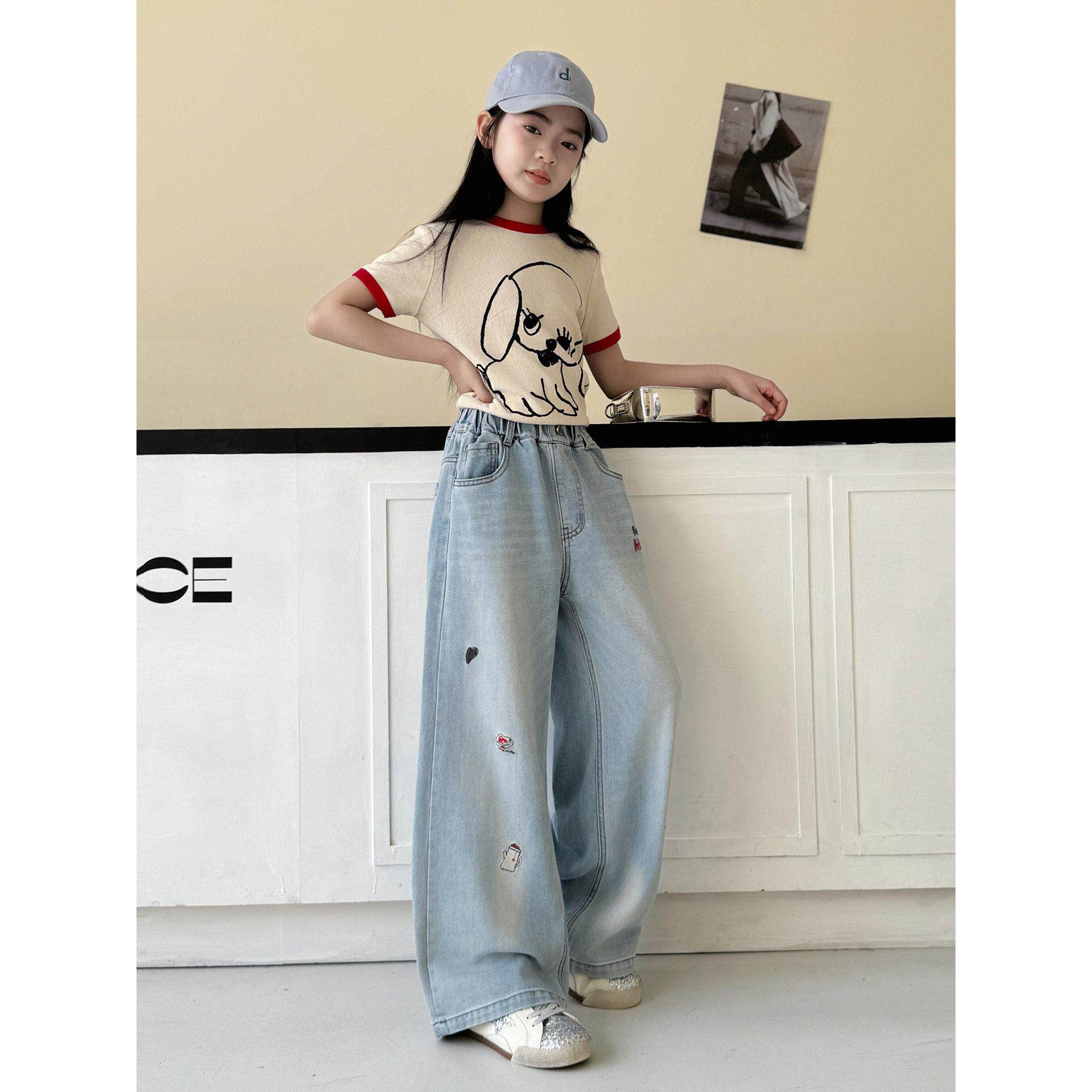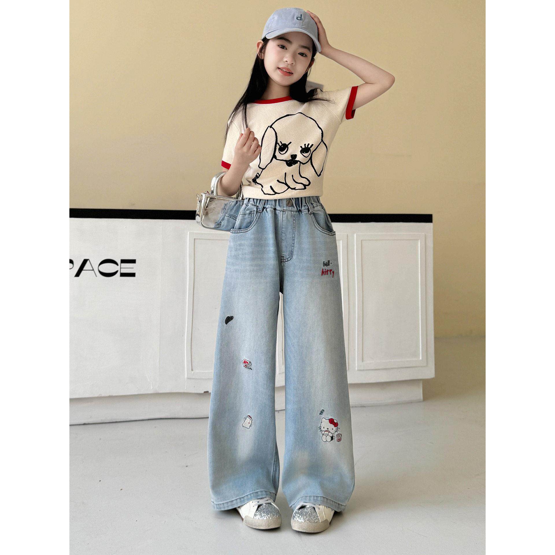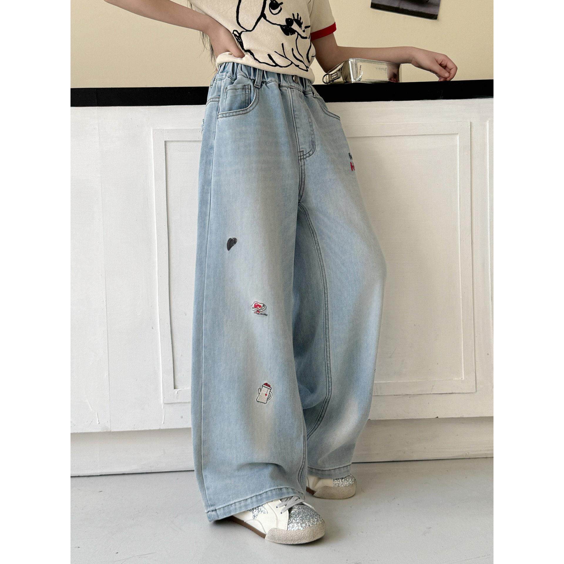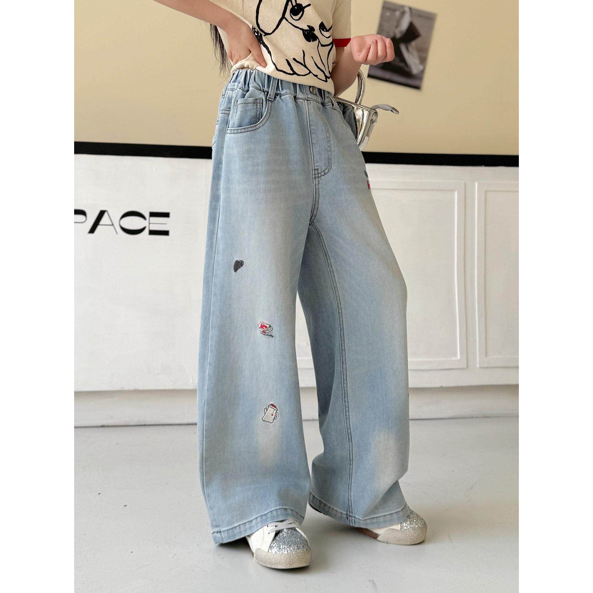 春装猫咪洋气牛仔裤刺绣阔腿裤2026女童大儿童裤子童女新款卡通中