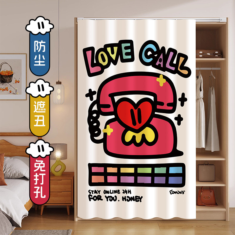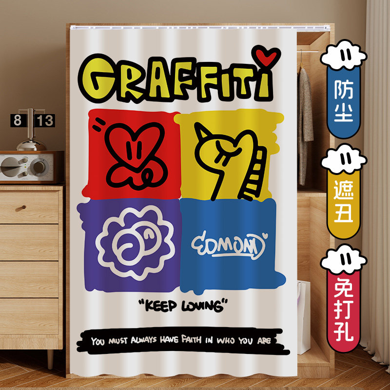 柜子遮挡帘卡通涂鸦书柜防尘帘橱柜遮丑帘开放衣柜拉帘滑轨布帘子
