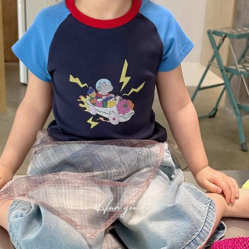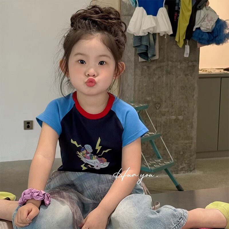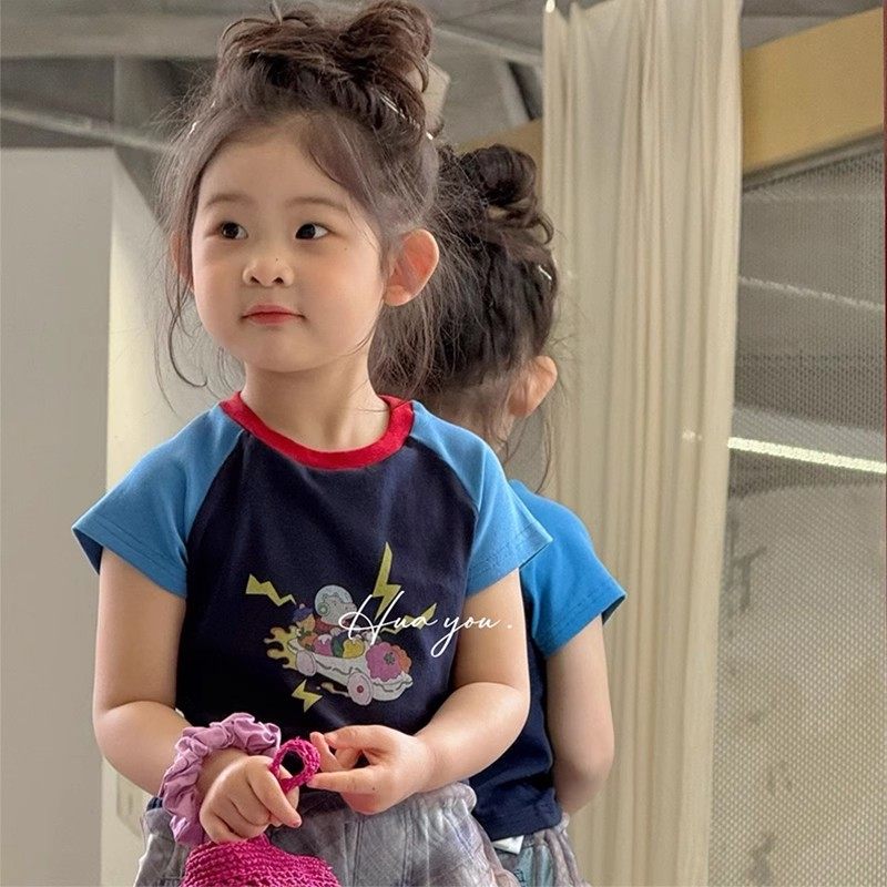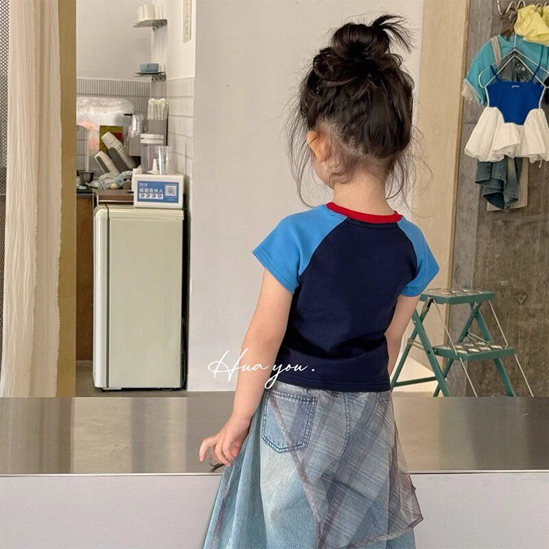 2026新款夏装女童时髦拼色百搭短袖t恤中小童短款纯棉圆领半袖衫