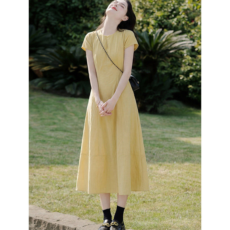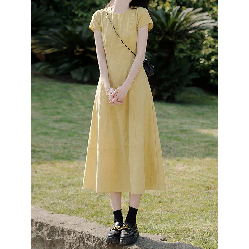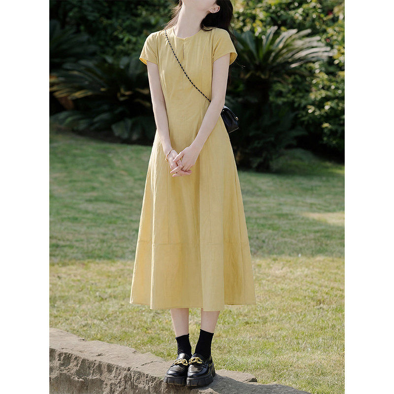 极简风黄色圆领短袖连衣裙女2026新款夏季小个子收腰宽松a字长裙