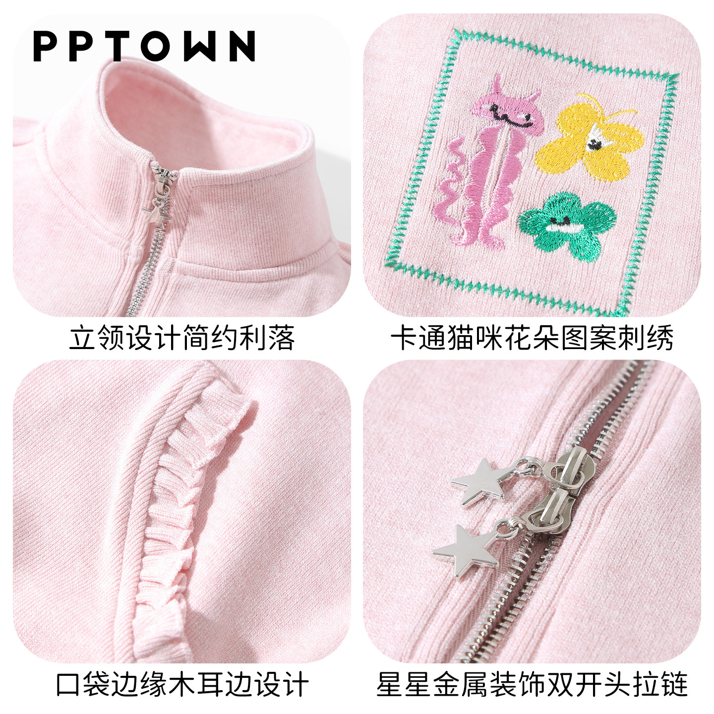 311线报网描述:卡通猫咪花朵图案刺绣点缀设计