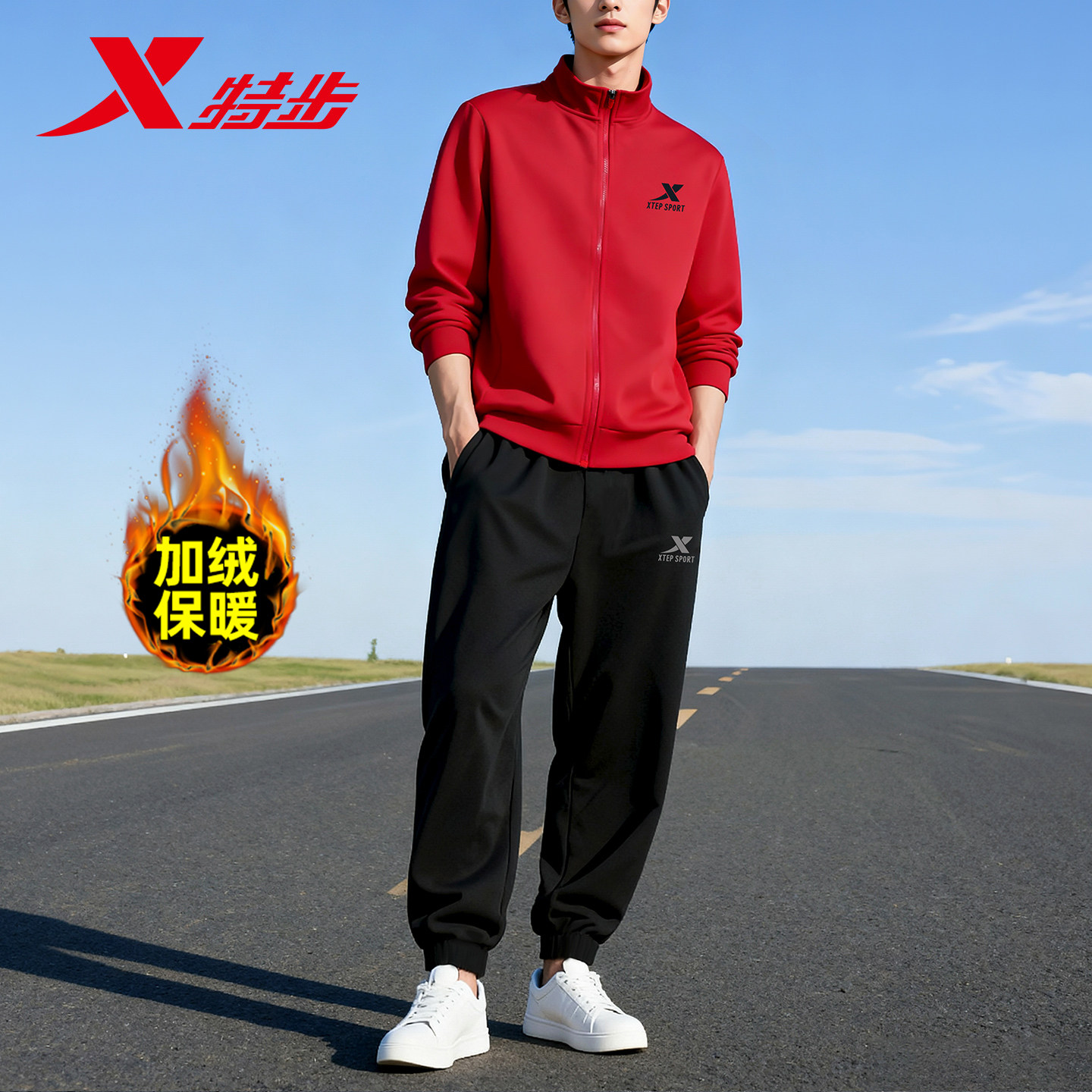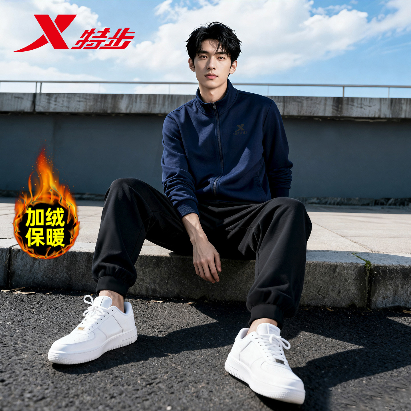 特步加绒运动服套装男款2026春季新款外套休闲夹克上衣长裤两件套