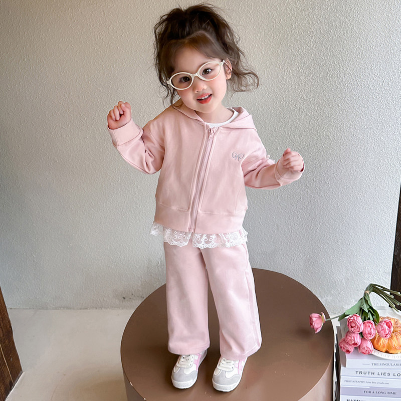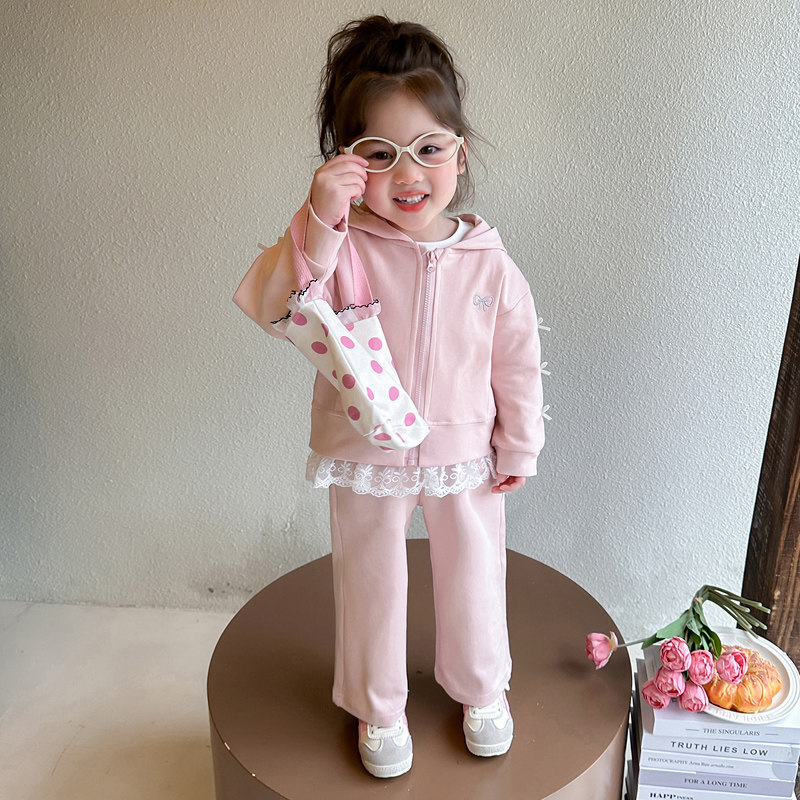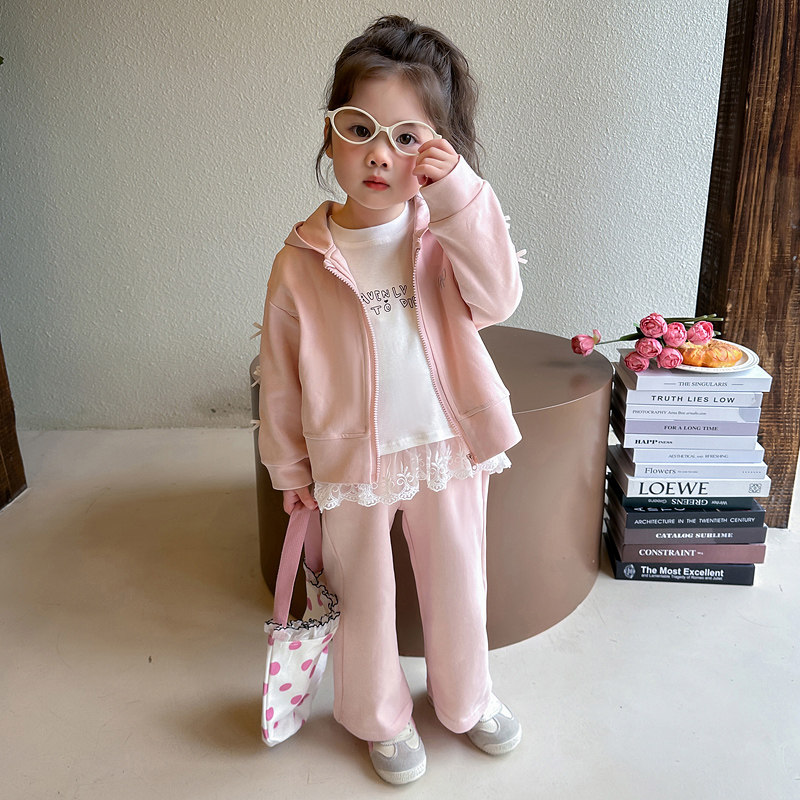 女童春装套装2026新款洋气时髦宝宝春季开衫儿童连帽卫衣三件套潮