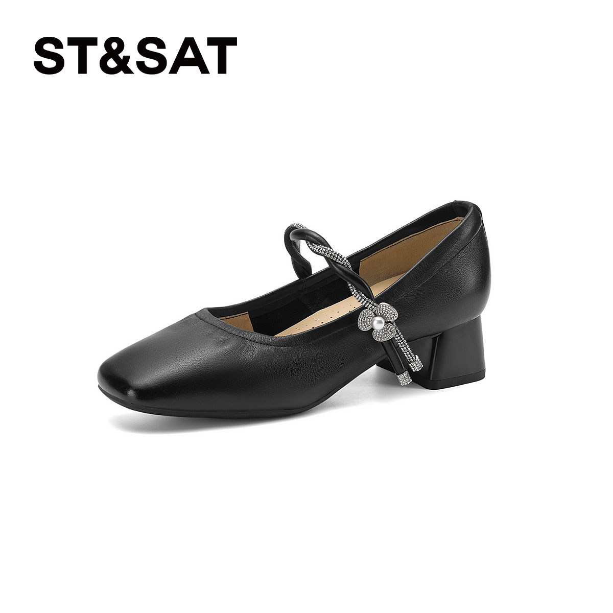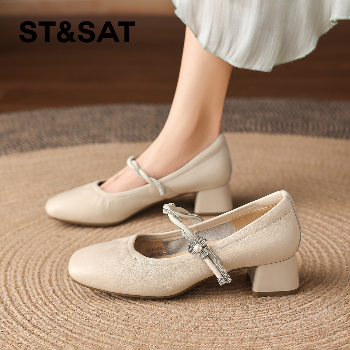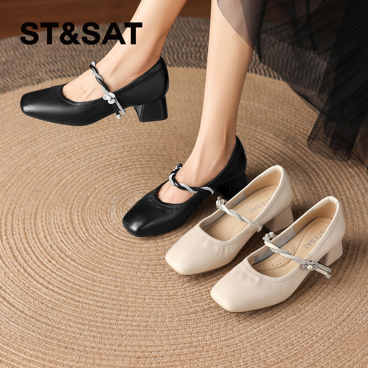 星期六水钻真皮玛丽珍鞋女鞋2026春季新款法式粗跟浅口单鞋配裙子