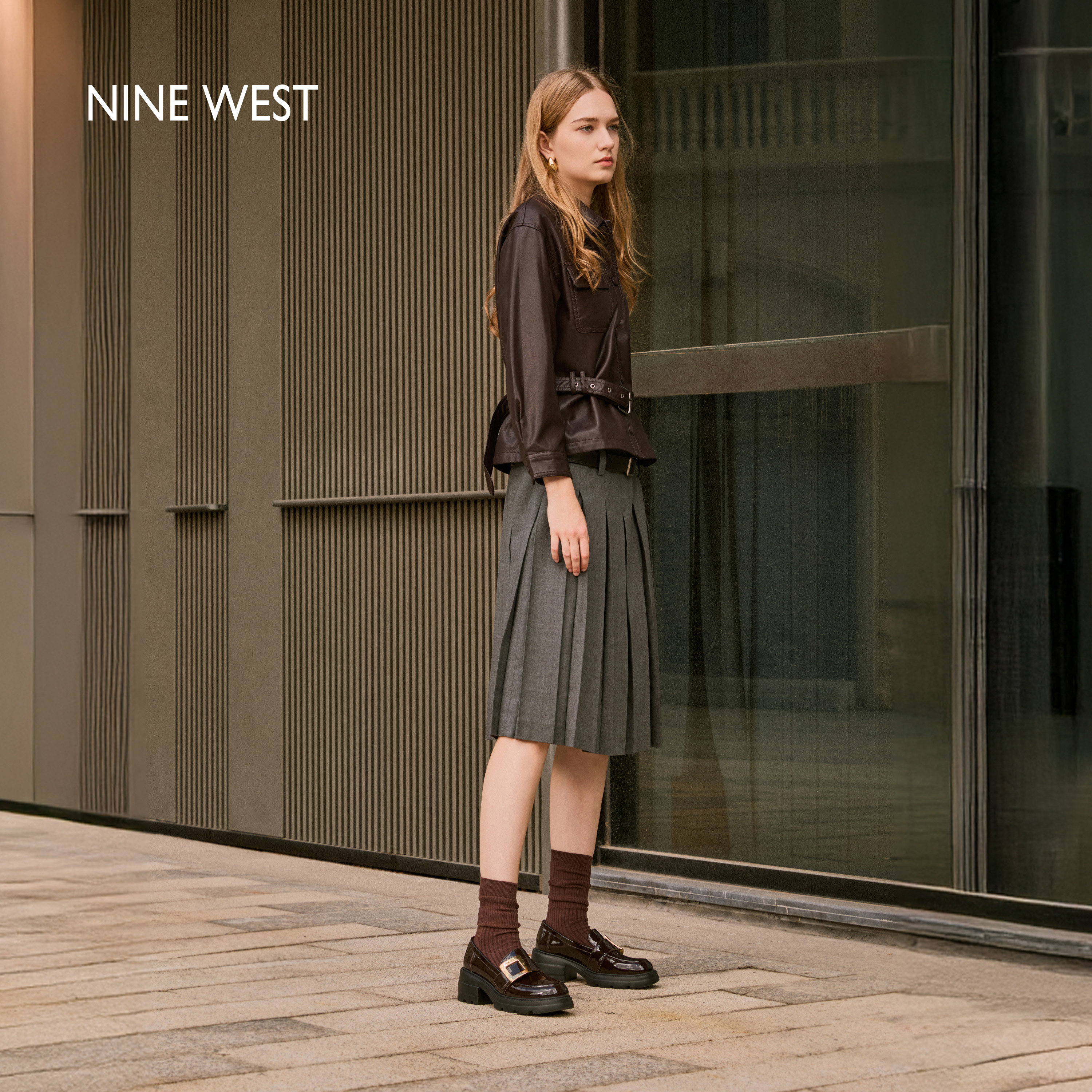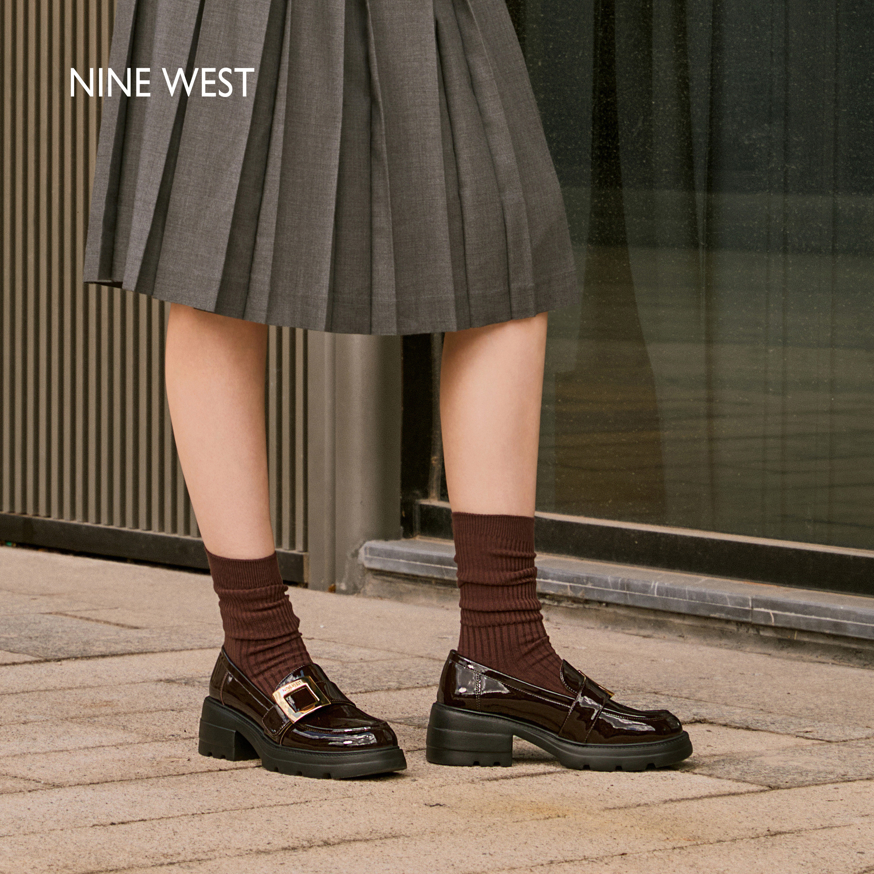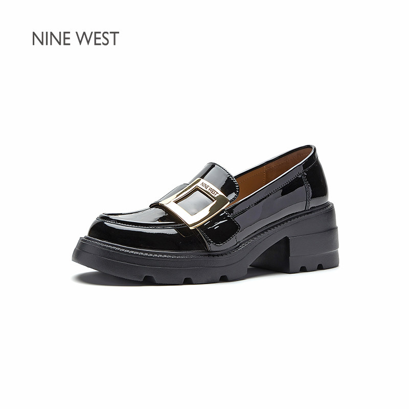 Nine West/玖熙金属扣真皮乐福鞋女春季新款英伦风小皮鞋单鞋
