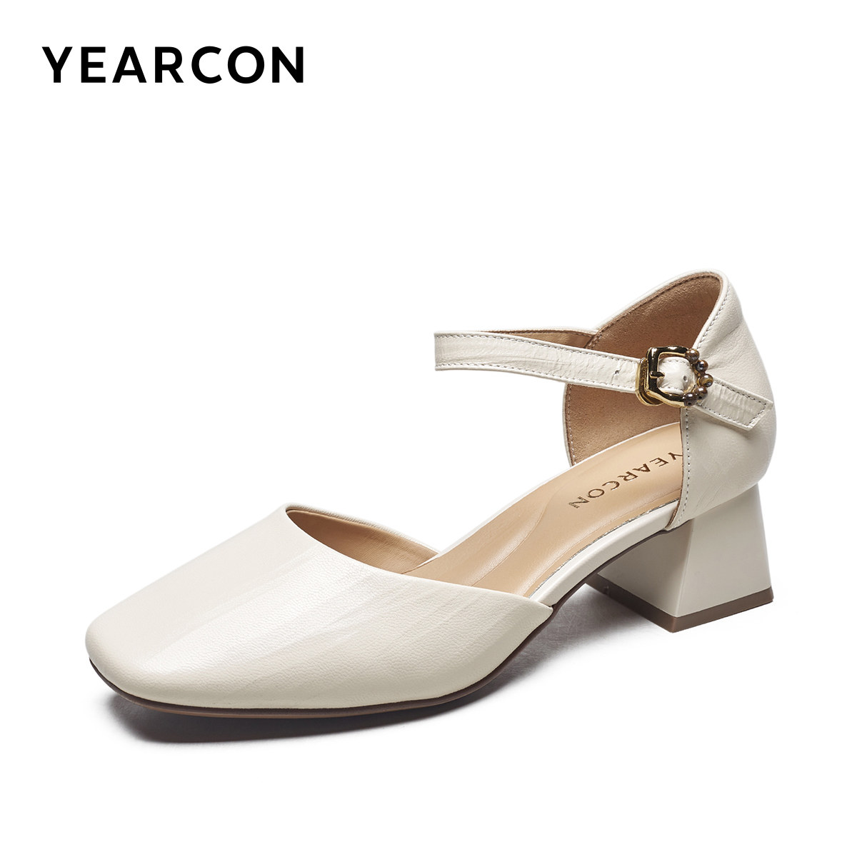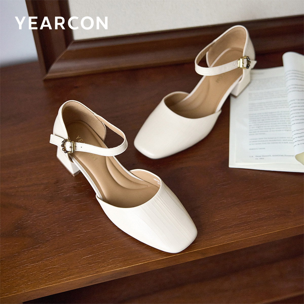 意尔康女鞋2026夏季单鞋真皮方头粗跟羊皮包头凉鞋外穿配裙子法式