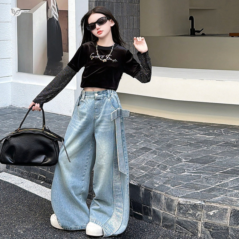女童套装2026年春季新款假两件T恤牛仔裤烫钻两件套中大童演出服