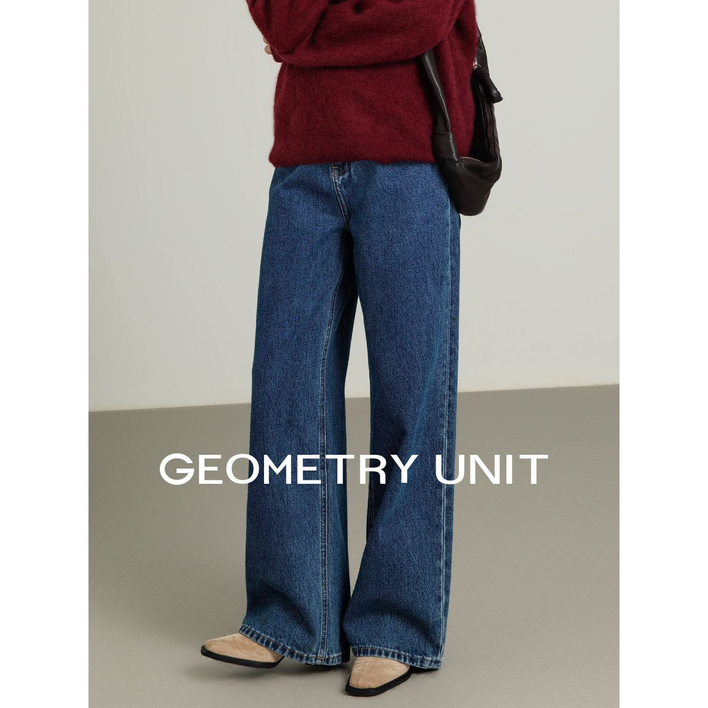几何单元窄版阔腿直筒牛仔裤女款经典蓝色高腰宽松显腿长拖地裤子