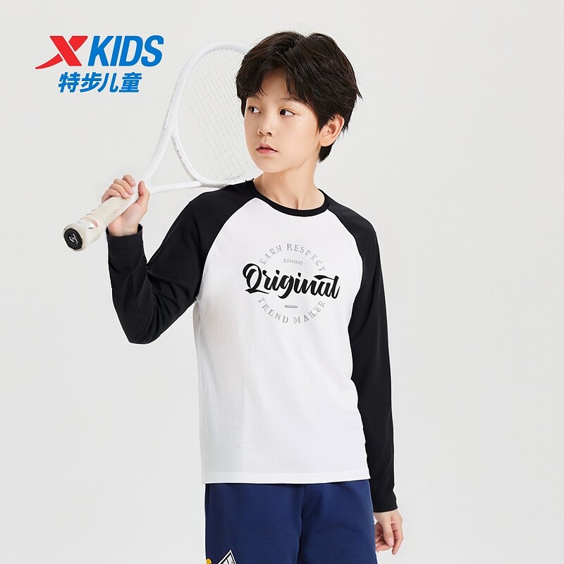特步童装春季男童拼接纯棉T恤儿童打底针织衫中大童圆领上衣春装