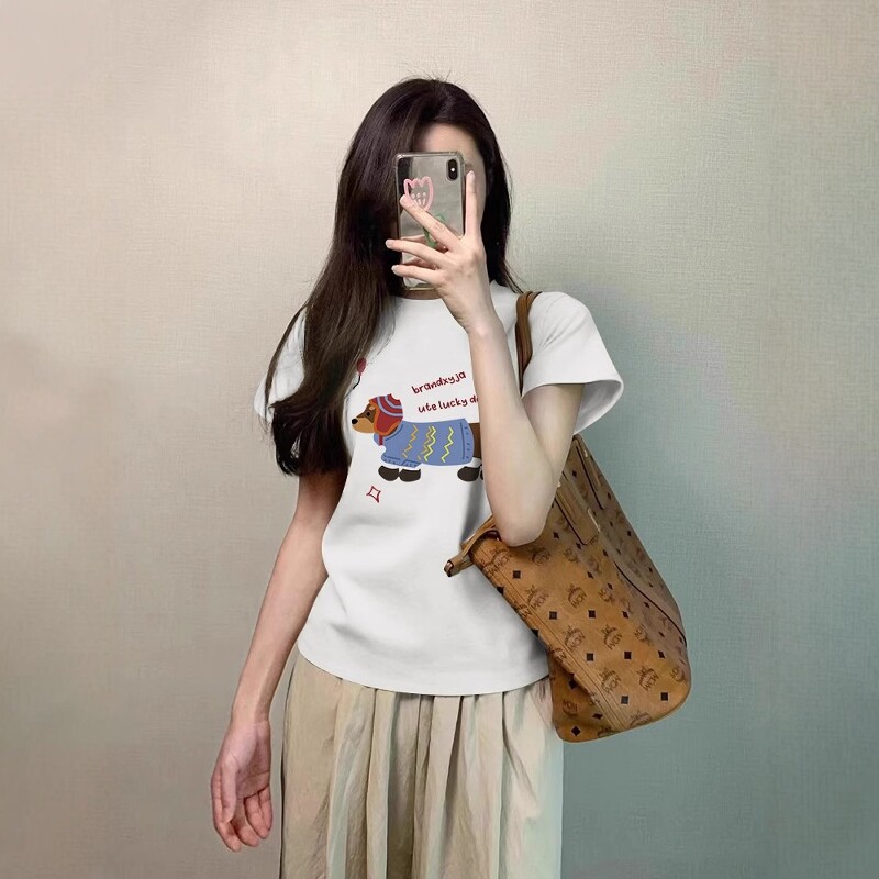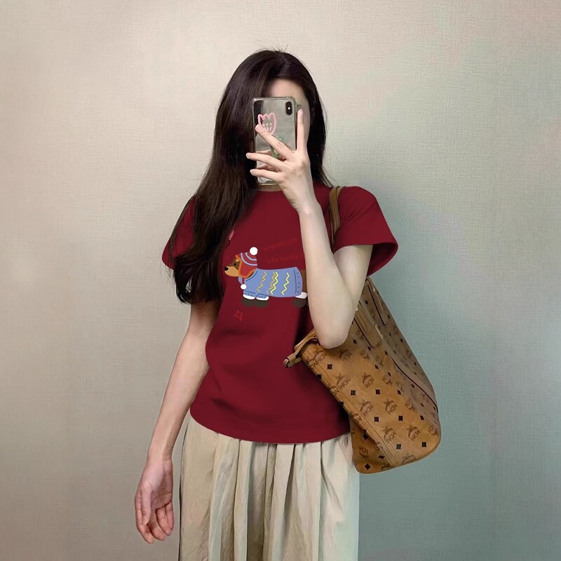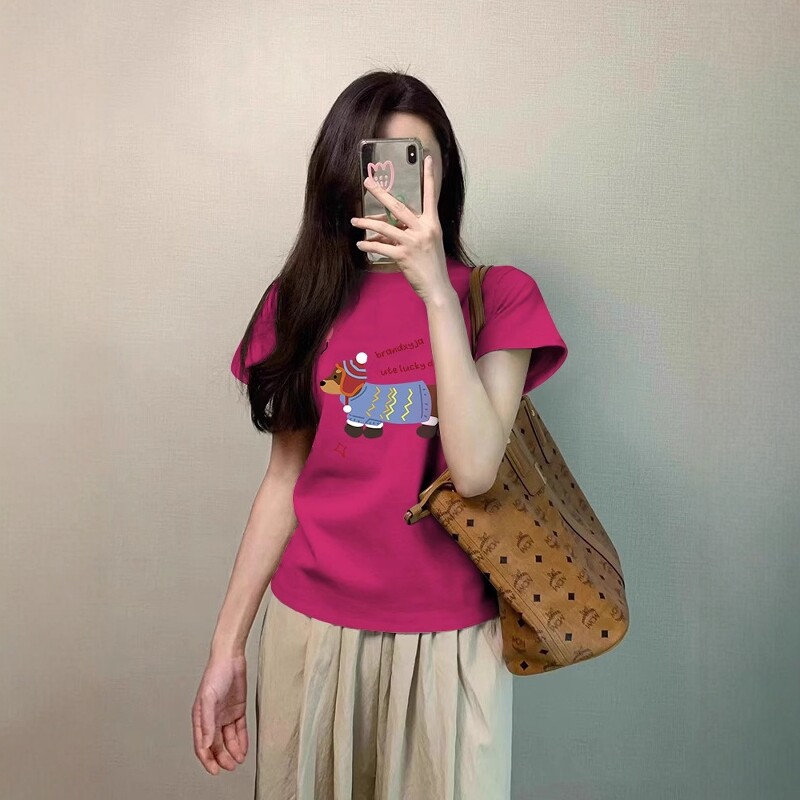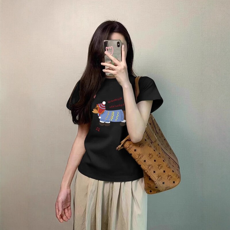 腊肠小狗印花t恤女款2026夏季打底内搭正肩纯棉短款修身短袖上衣