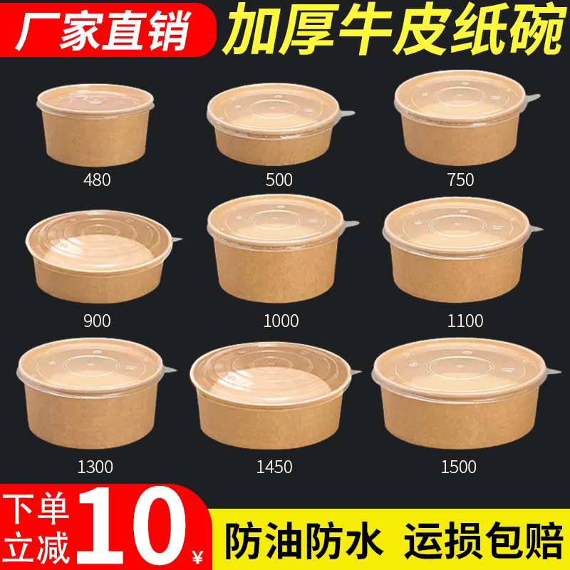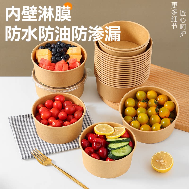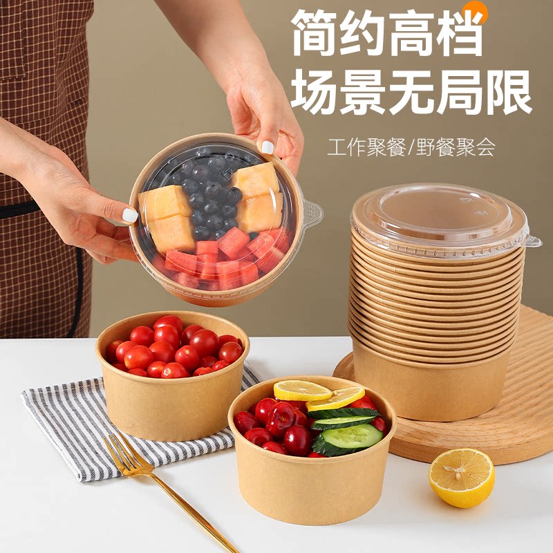 牛皮纸打包盒圆形带盖一次性纸碗饭碗野餐盒加厚外卖快餐盒水果切