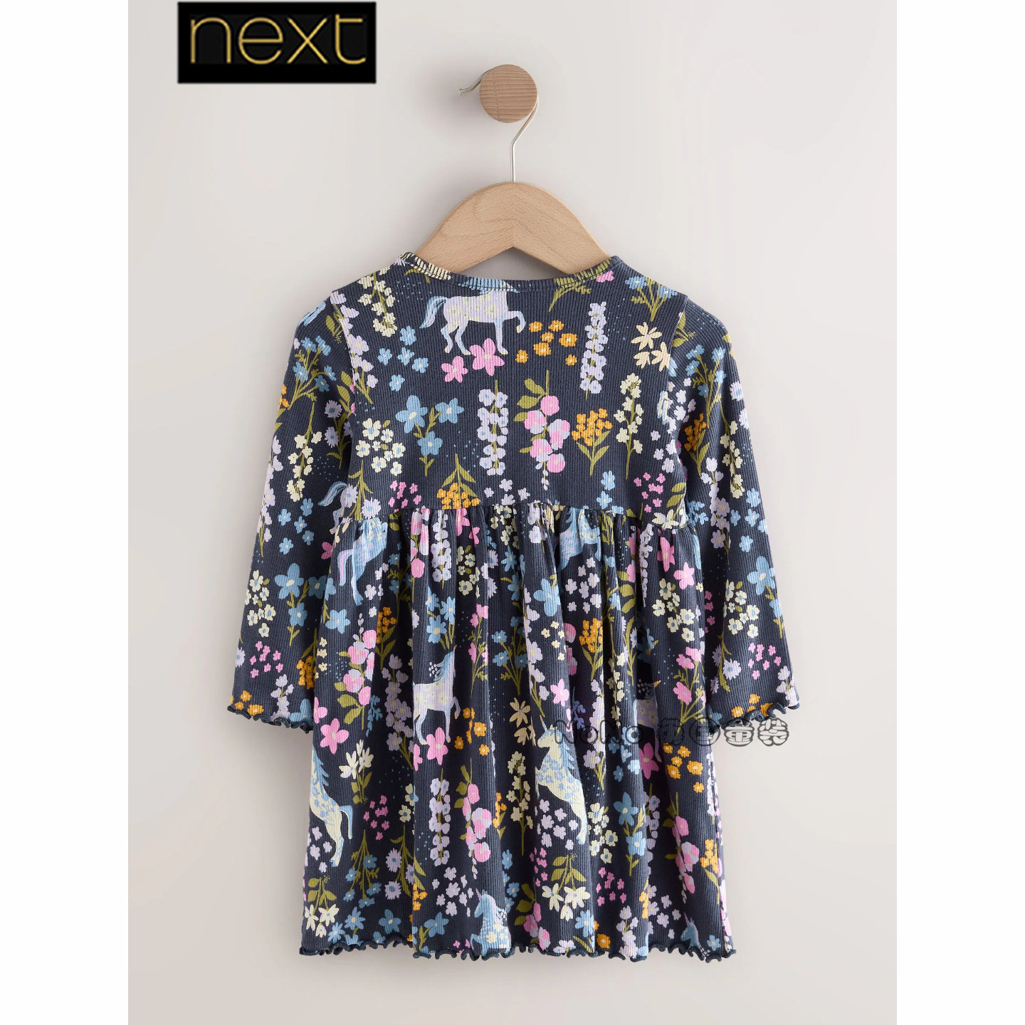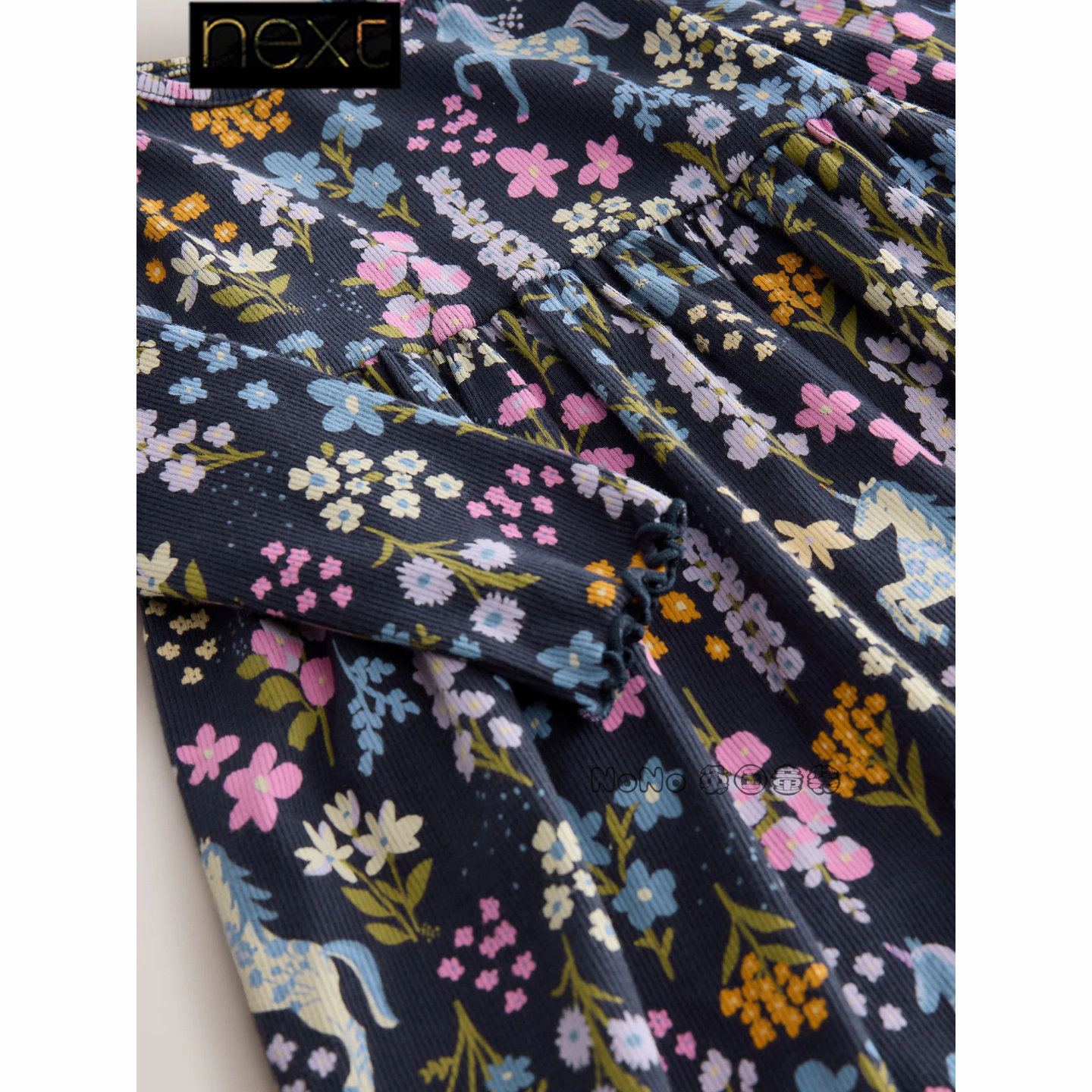 英国Next代购女童深蓝色独角兽碎花连衣裙长袖1-7岁春秋H96-941