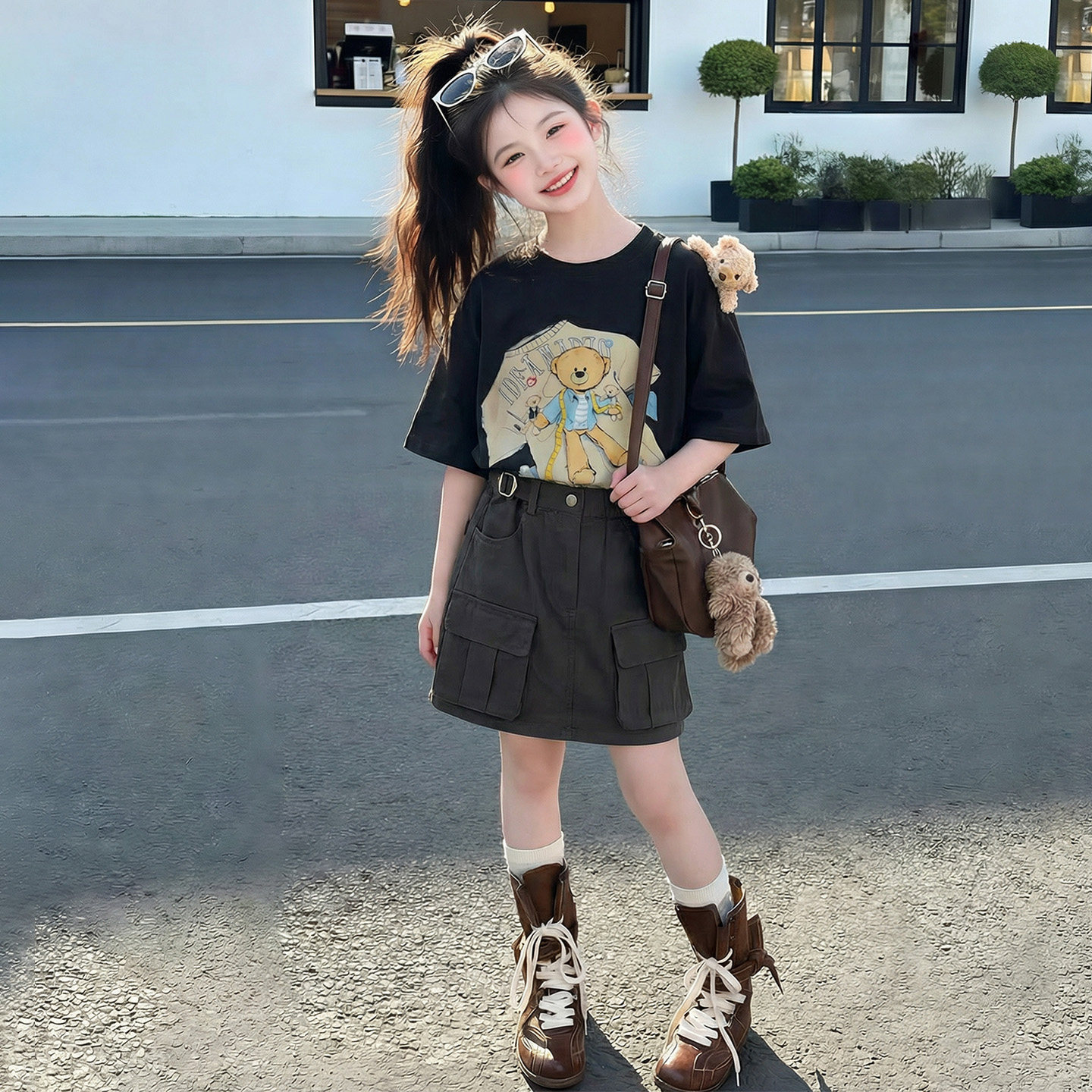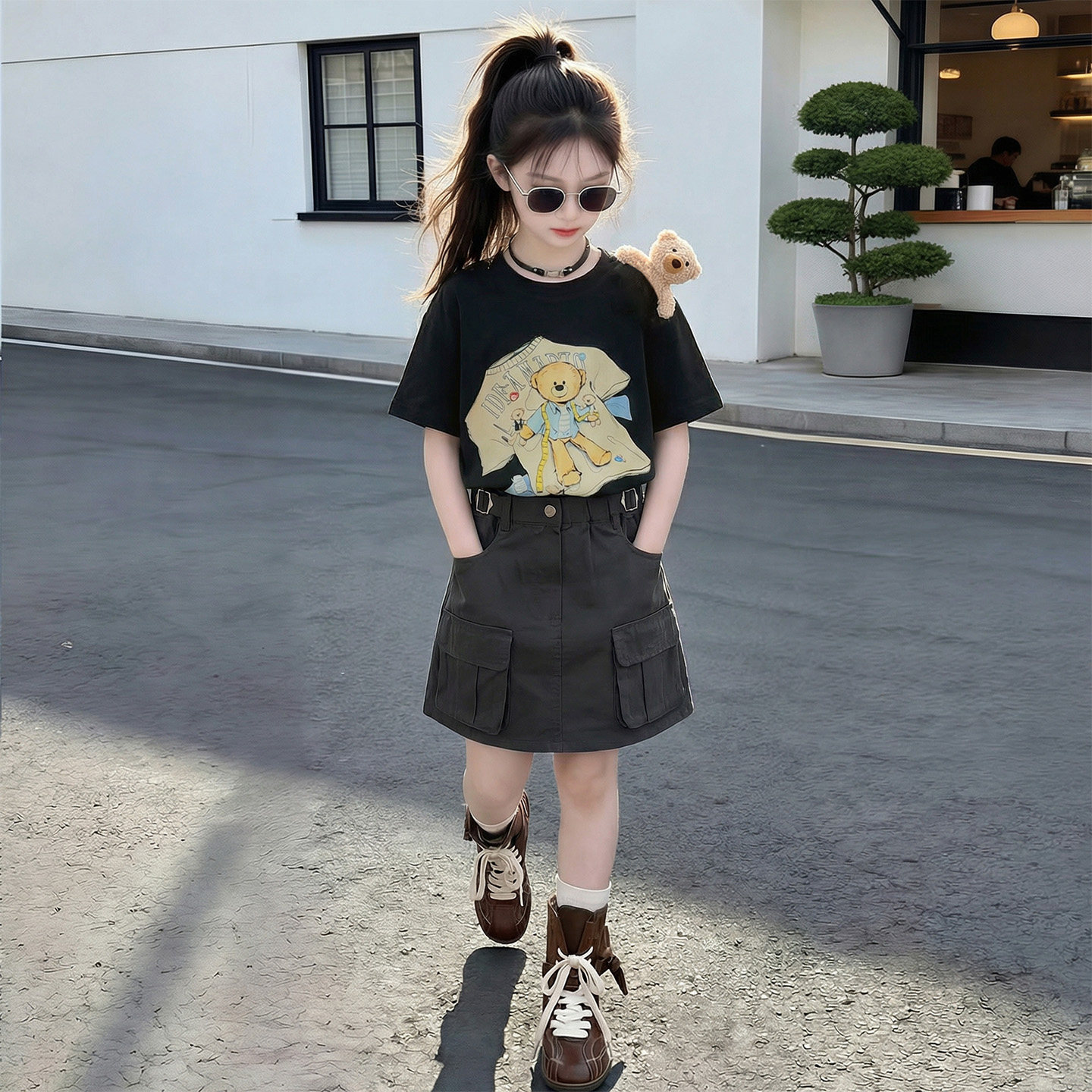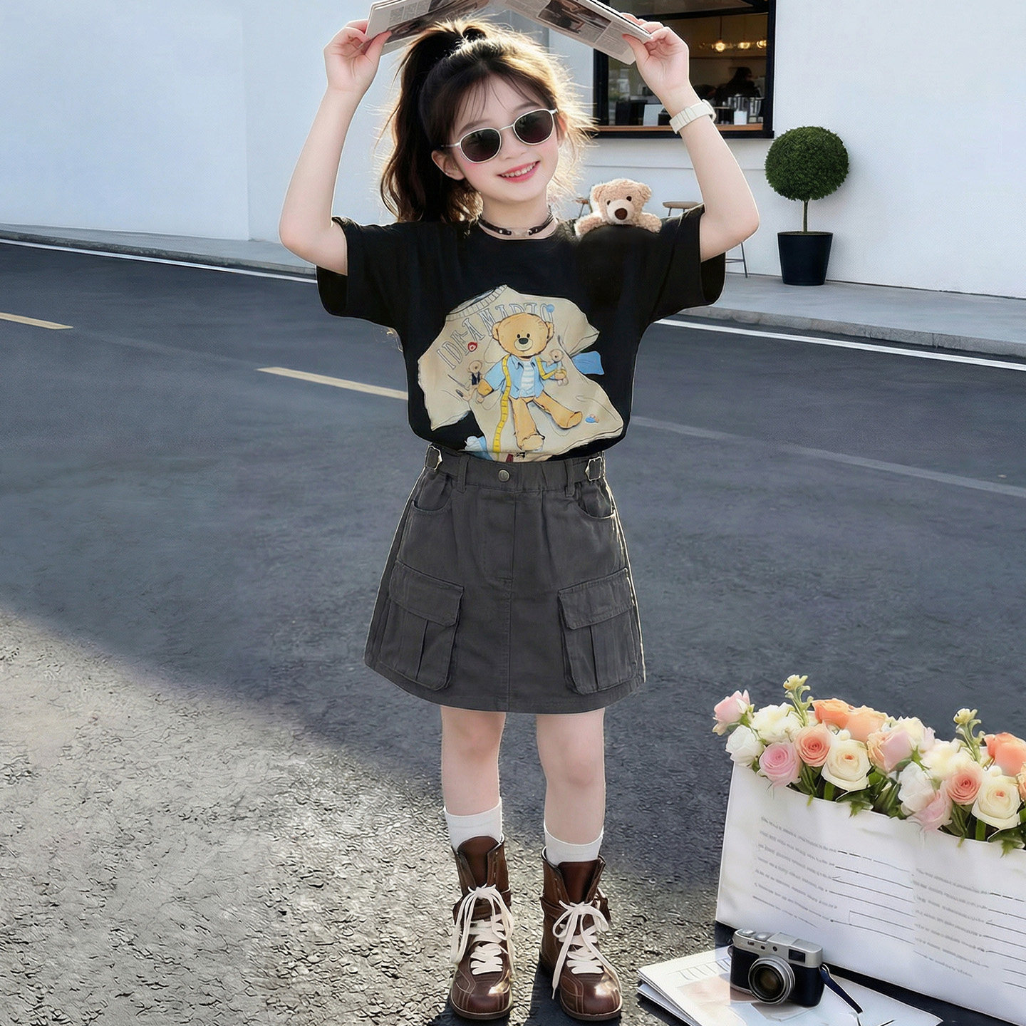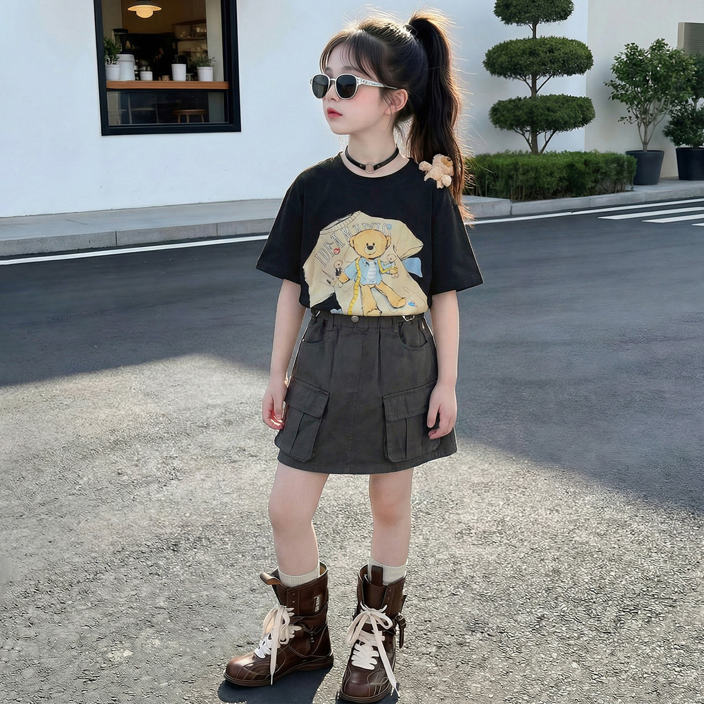 女童巨好看短袖T恤2026夏季新款洋气女孩薄款深灰色工装短裙套装