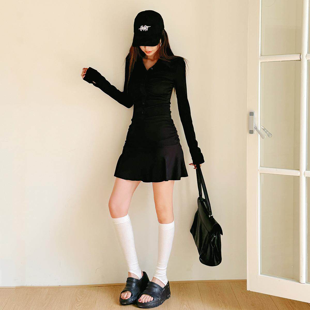 浅布调断码5折清仓辣妹收腰褶皱短款连衣裙女polo领长袖修身a字裙