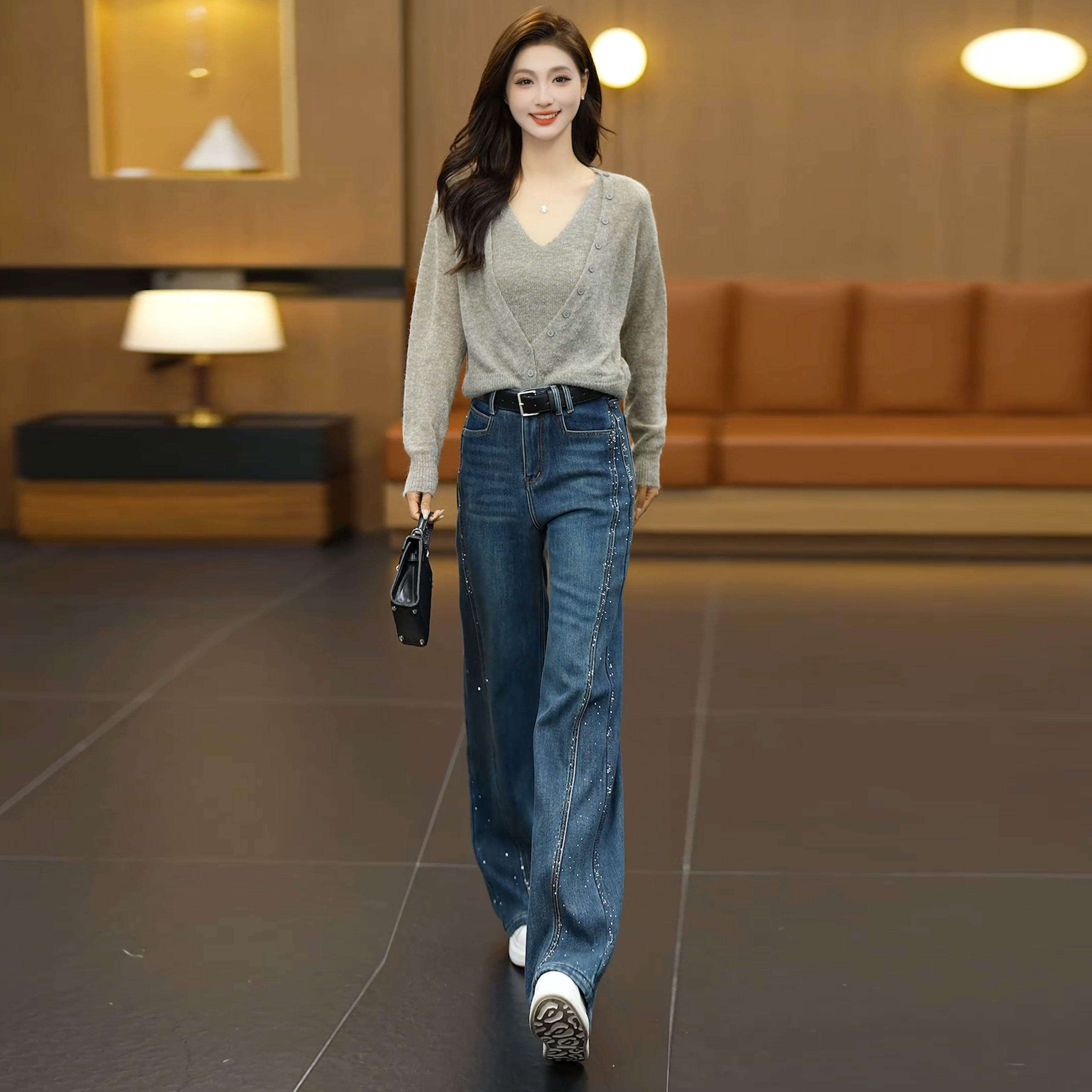 灰色高腰显瘦春秋女款牛仔裤子2026新款宽松显瘦松弛感烫钻阔腿裤