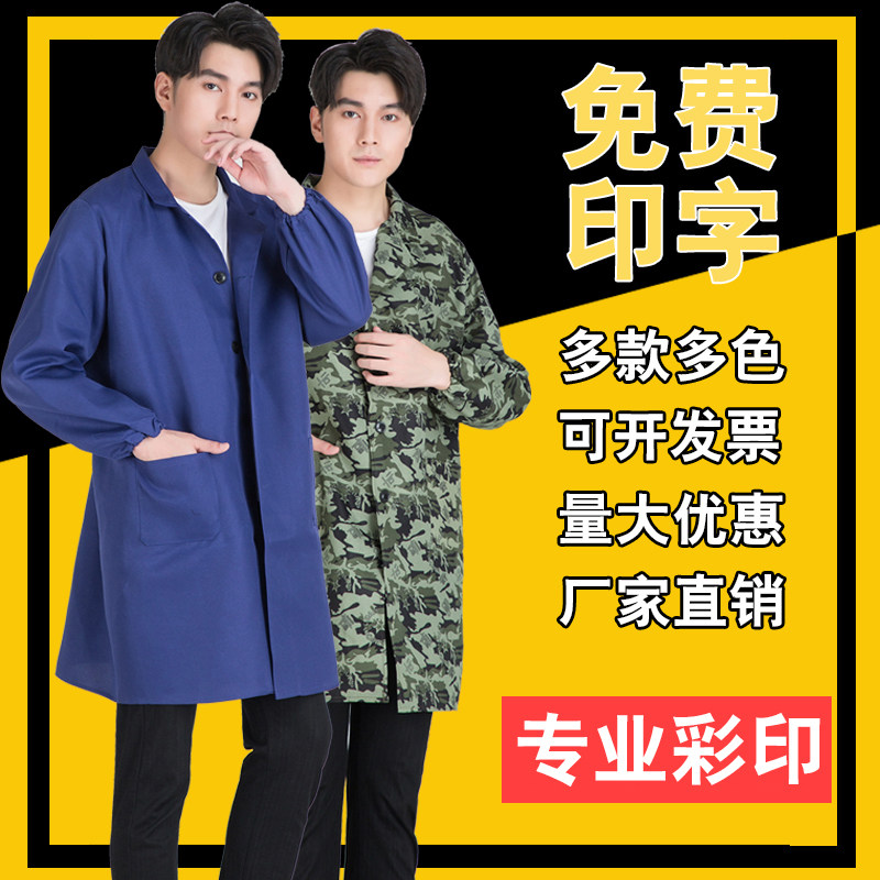 定制印字新款上衣工作服男装迷彩大褂罩衣长袖劳保防尘蓝大褂厨房