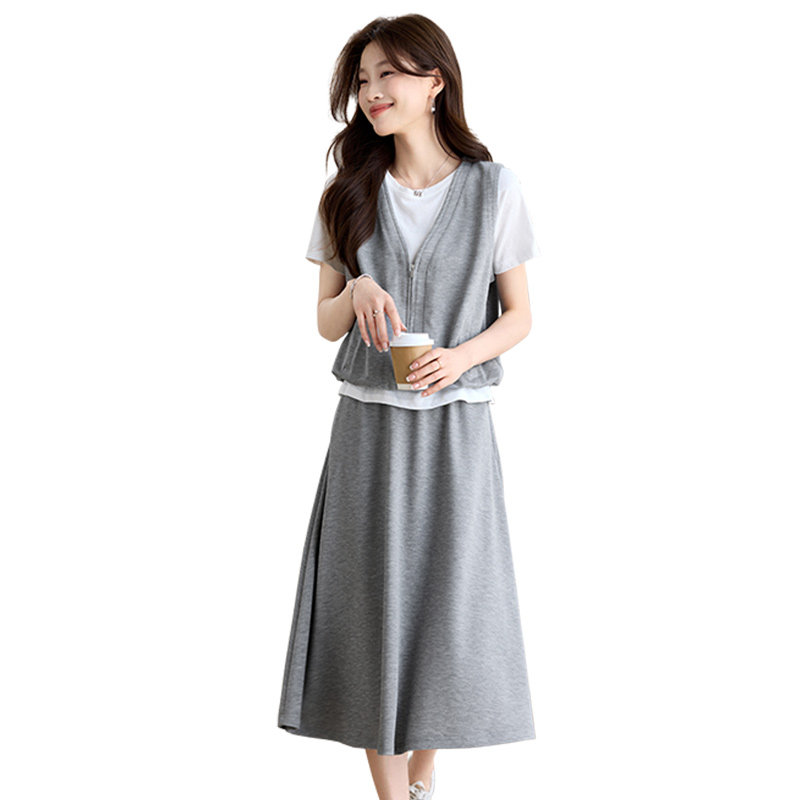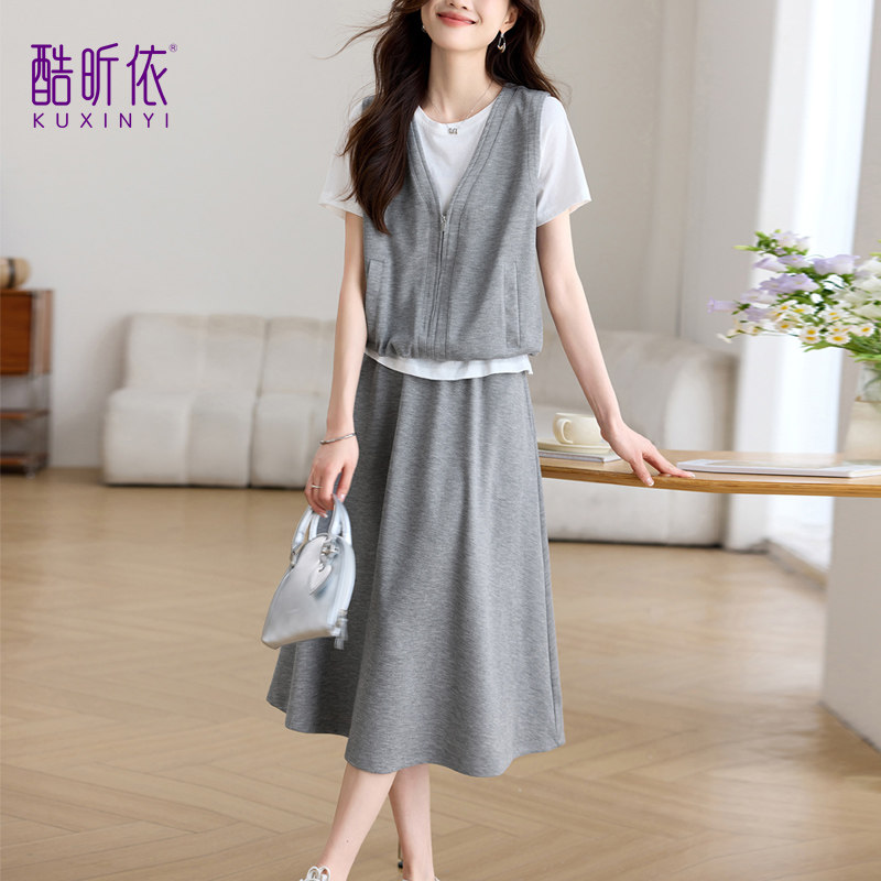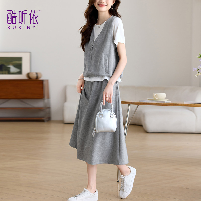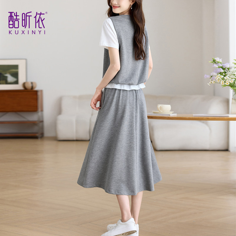 时尚套装女2026年夏季新款宽松休闲减龄半身裙子马甲上衣假两件套