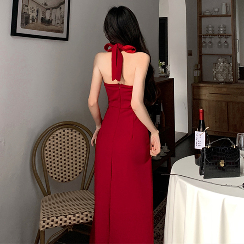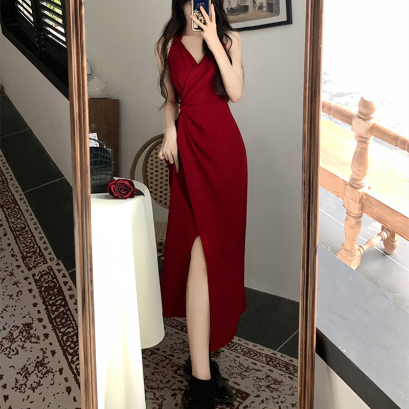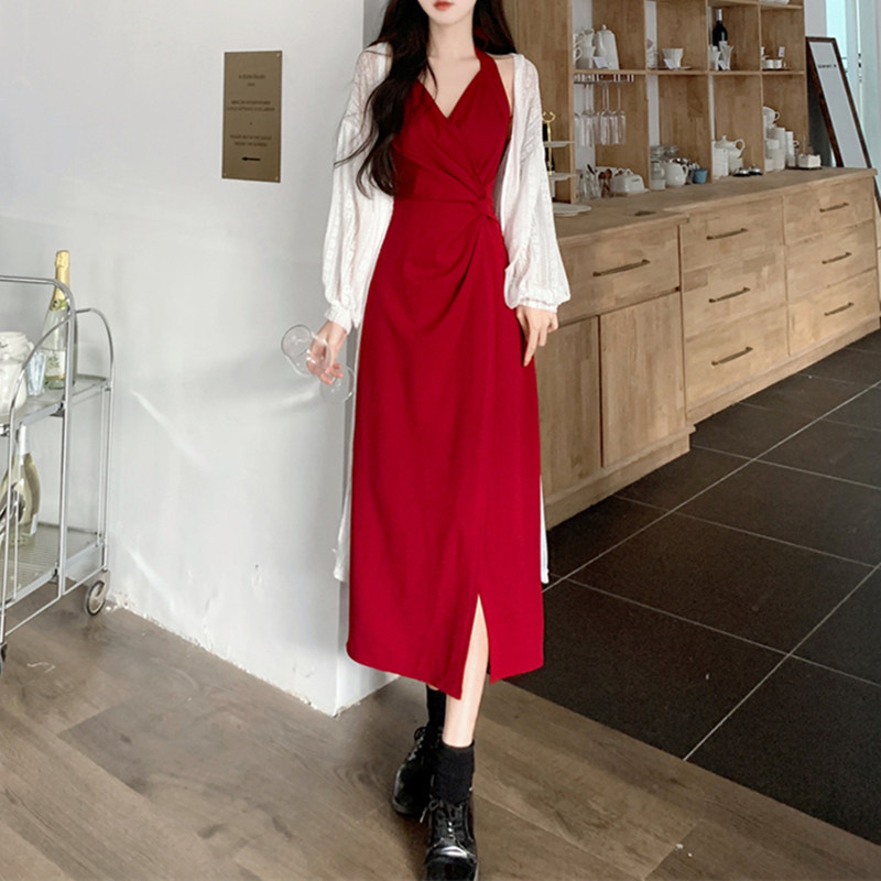 大码女装复古挂脖连衣裙两件套春夏蕾丝开衫胖mm红色吊带开叉长裙