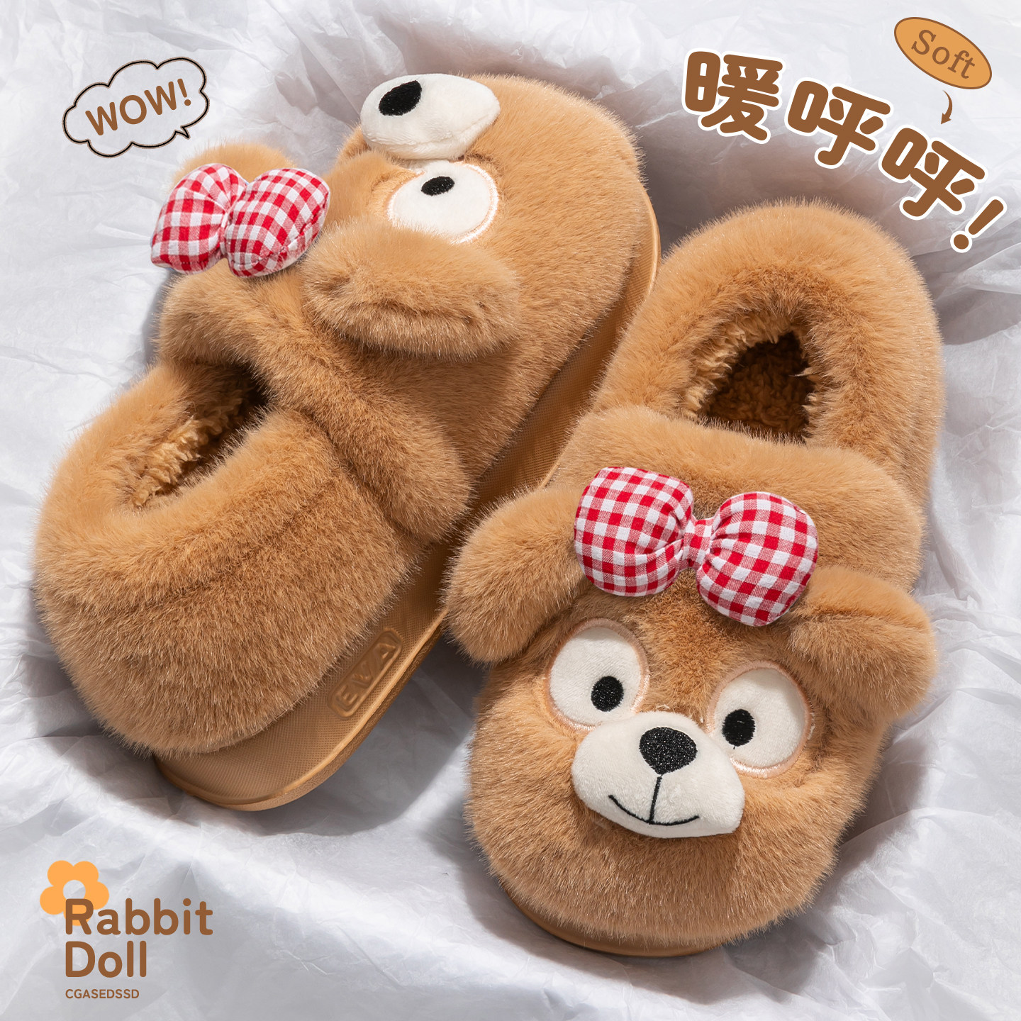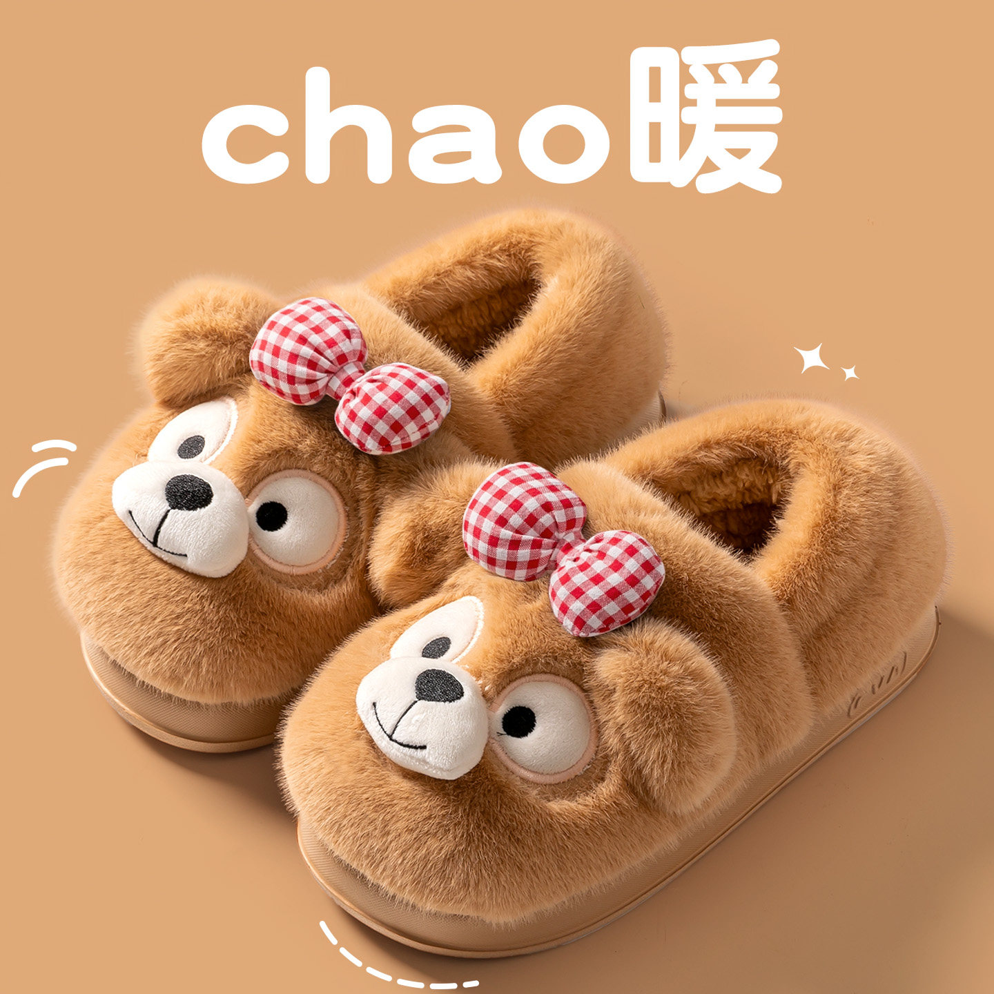 可爱小熊棉拖鞋女款包跟秋冬季居家宿舍厚底防滑外穿保暖毛绒棉鞋