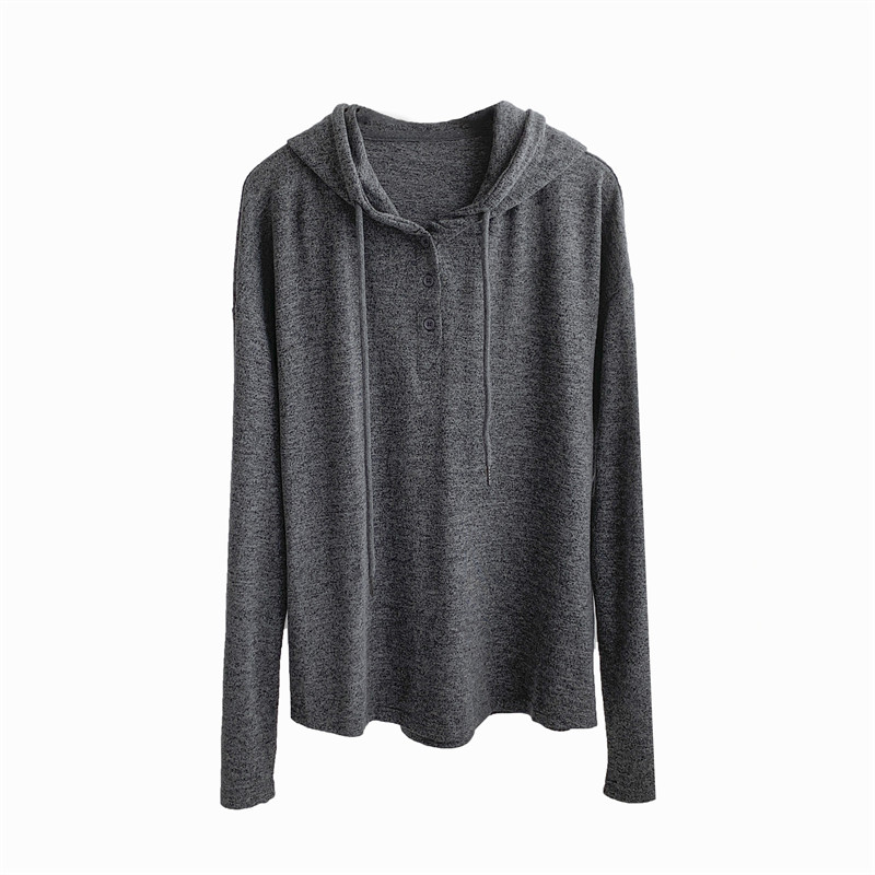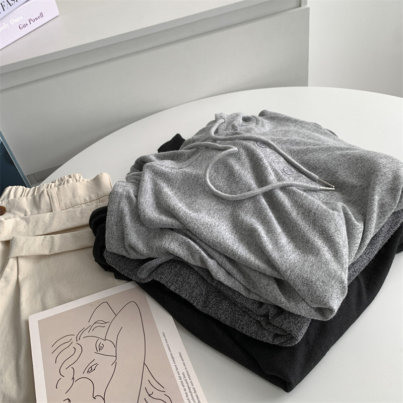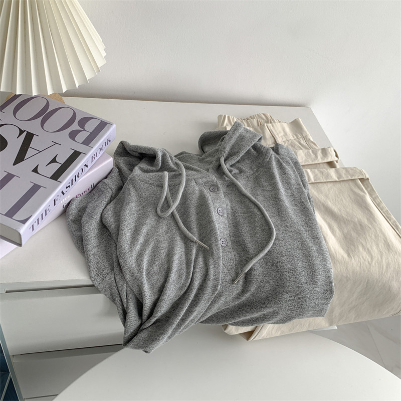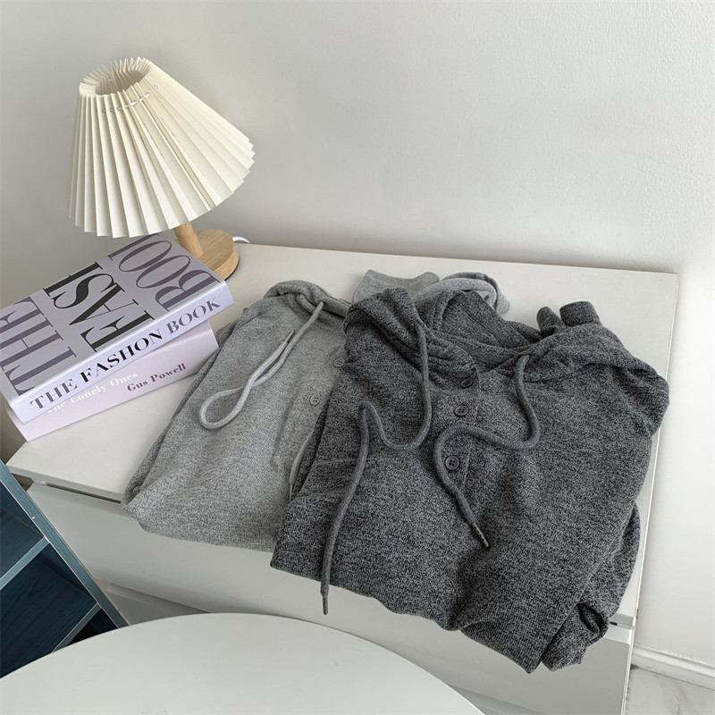 针织衫韩版春秋宽松慵懒风上衣前短后长帽衫垂坠感纽扣针织连帽女