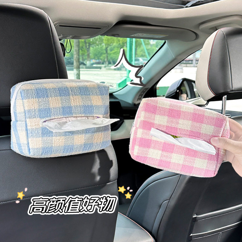简约格子车载纸巾盒创意布艺汽车挂式抽纸盒多功能高级感纸巾袋